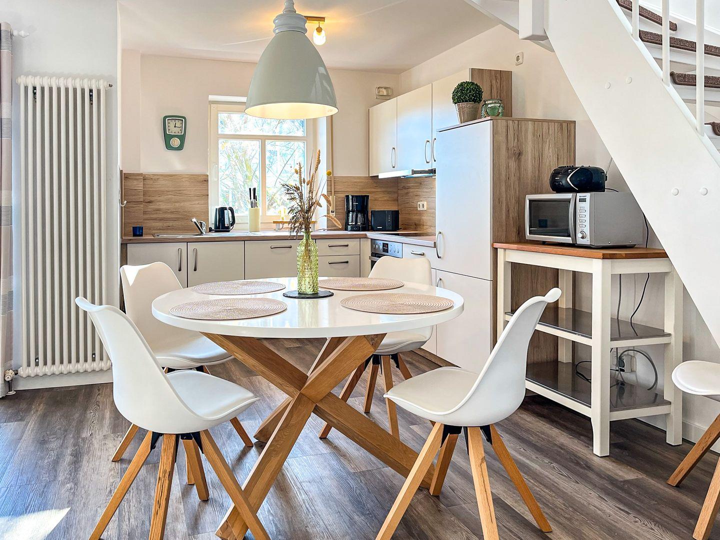 Der vollständig ausgestattete Küchenbereich ist mit einem Geschirrspüler, einem 4-Platten-Cerankochfeld mit Backofen, einer Mikrowelle sowie einem Kühlschrank mit Gefrierfach ausgestattet. Ein Essbereich für die Einnahme der Mahlzeiten ist ebenfalls vorhanden.