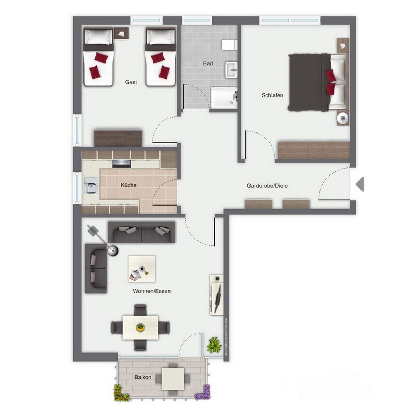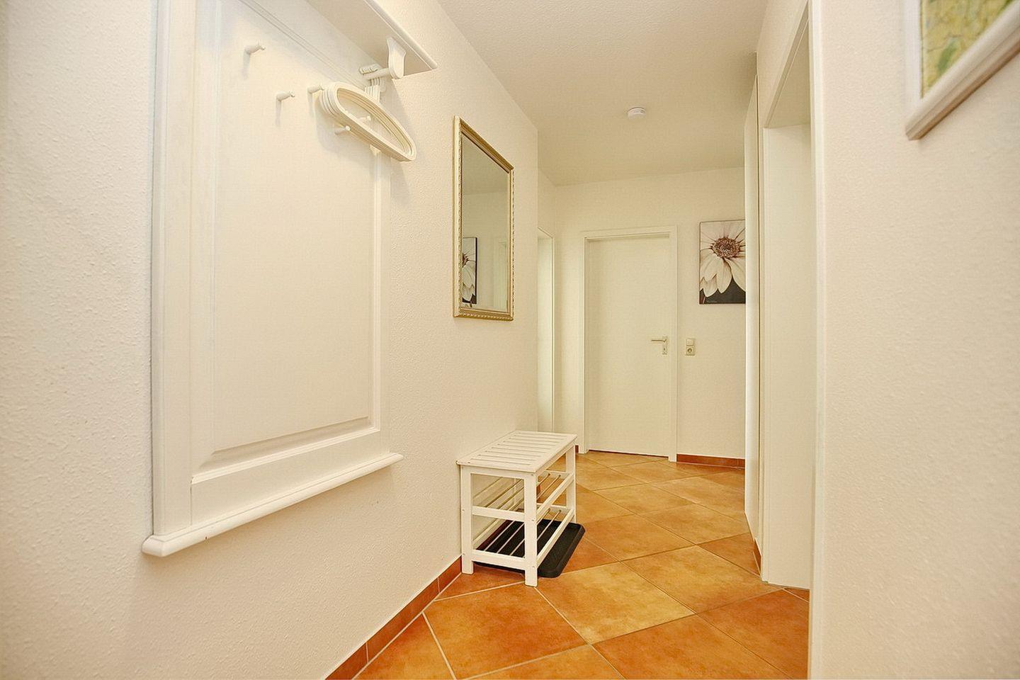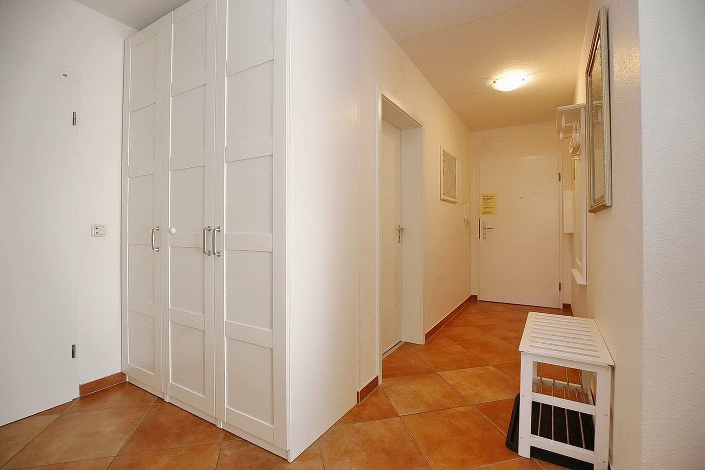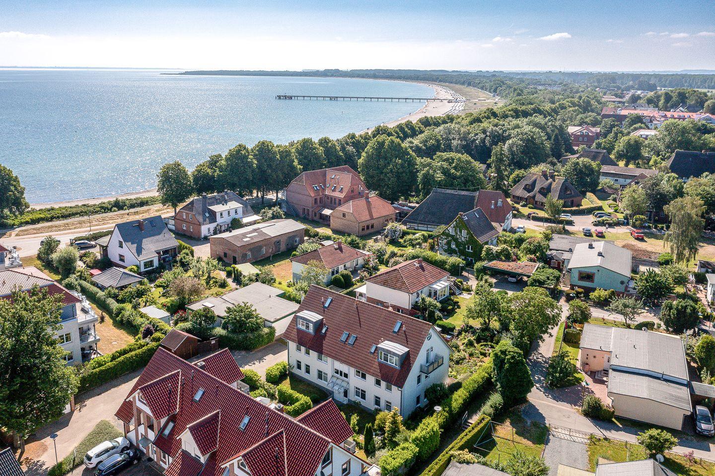 Dein Apartment liegt im 1. OG des Hauses und verfügt über einen Süd-Ost Balkon, von dem aus du einen Teilseeblick genießen kannst. Zur Wohnung mit einer Fläche von 63 m² gehören ein Wohn- und Essbereich, zwei Schlafzimmer, eine Küche und ein Duschbad. Zum Strand sind es nur ca. 100 m.