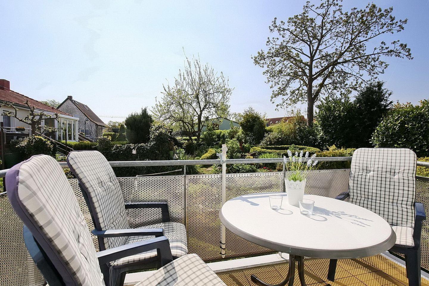 Vom Wohnzimmer aus betrittst du den möblierten Balkon. Der Wohnbereich ist mit einer Sitzgruppe und einem Essplatz eingerichtet. Ein Flachbild-TV, ein DVD-Player und eine Stereoanlage sorgen für Unterhaltung.