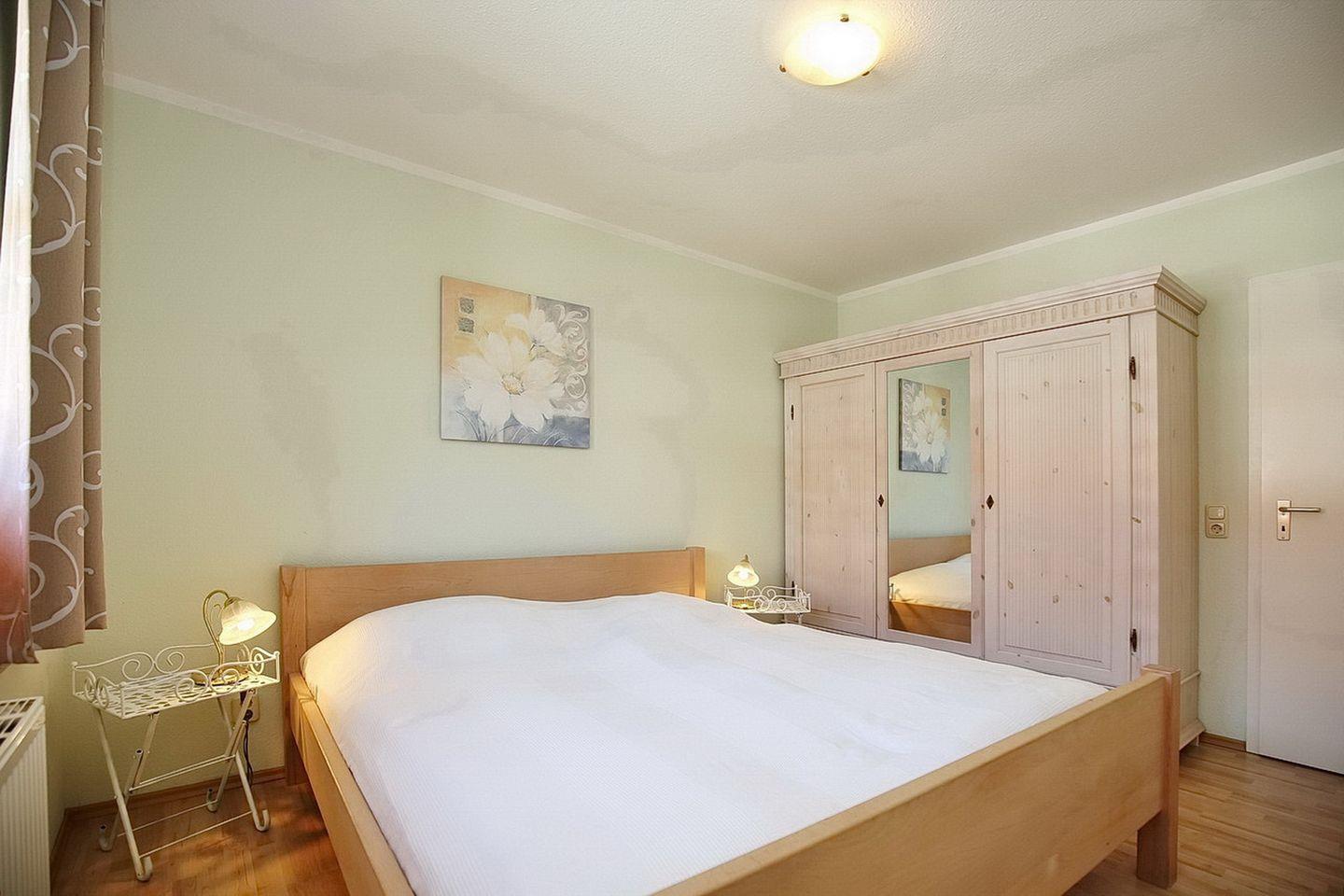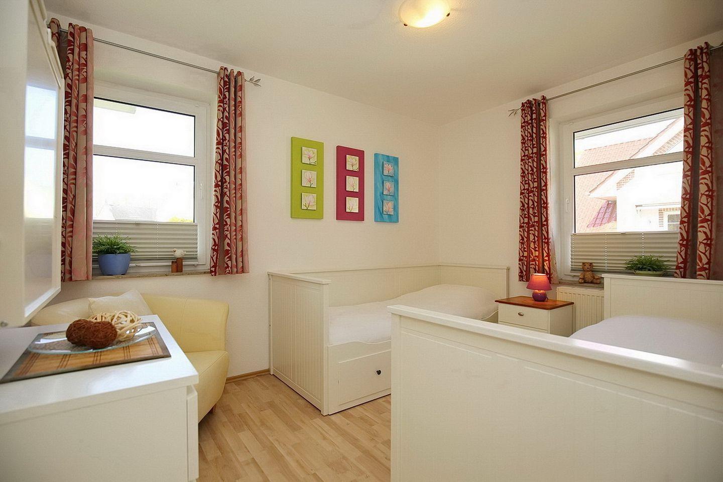 In den freundlichen Schlafzimmern findest du ein Doppelbett (2 x 90 x 200 cm) mit einem Kleiderschrank und zwei Einzelbetten (90 x 200 cm) mit einer Kommode sowie einen Wickeltisch zum Ausklappen vor. Der Bodenbelag ist im Wohn- und Schlafbereich mit hochwertigem Laminat ausgelegt.