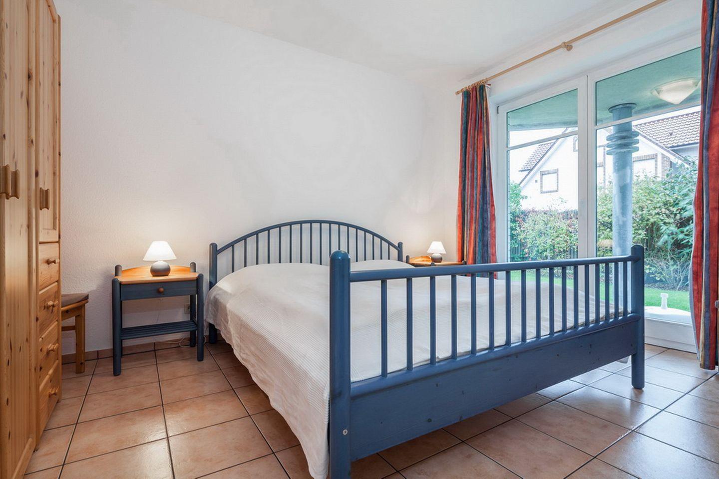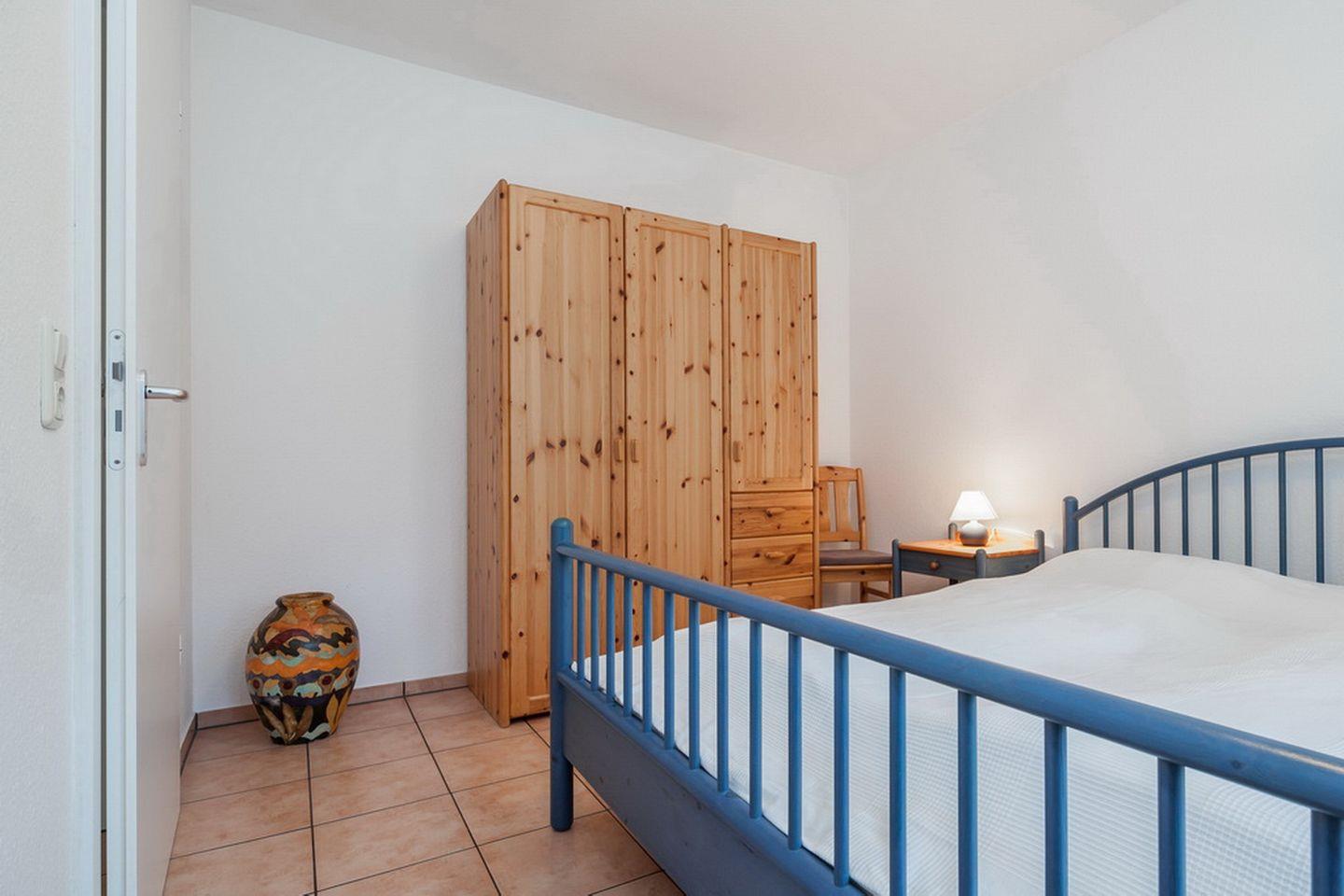 Das Schlafzimmer ist mit einem Doppelbett (2 x 90 x 200 cm) eingerichtet. Ein Kleiderschrank verschafft zusätzlichen Stauraum. Als Verdunklung an den Fenstern wurden Vorhänge gewählt.