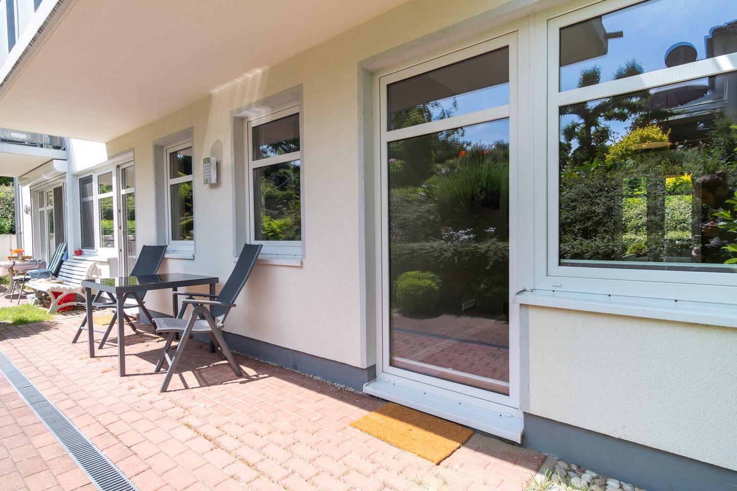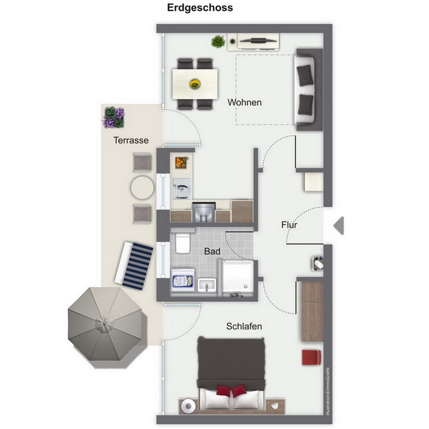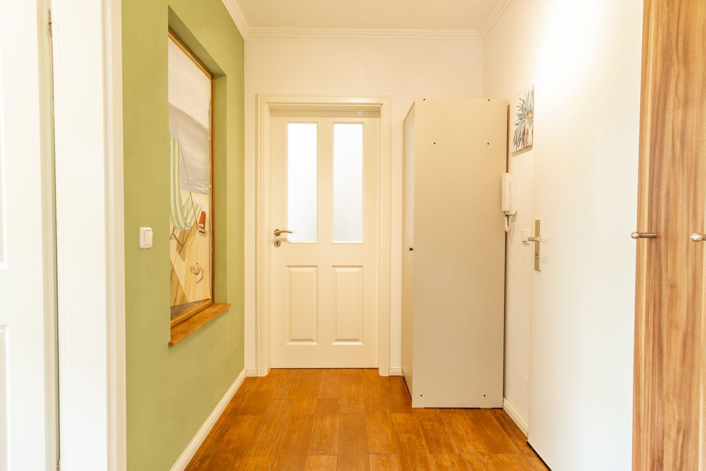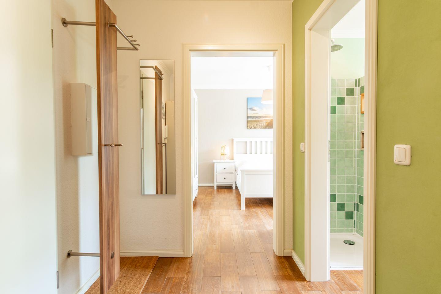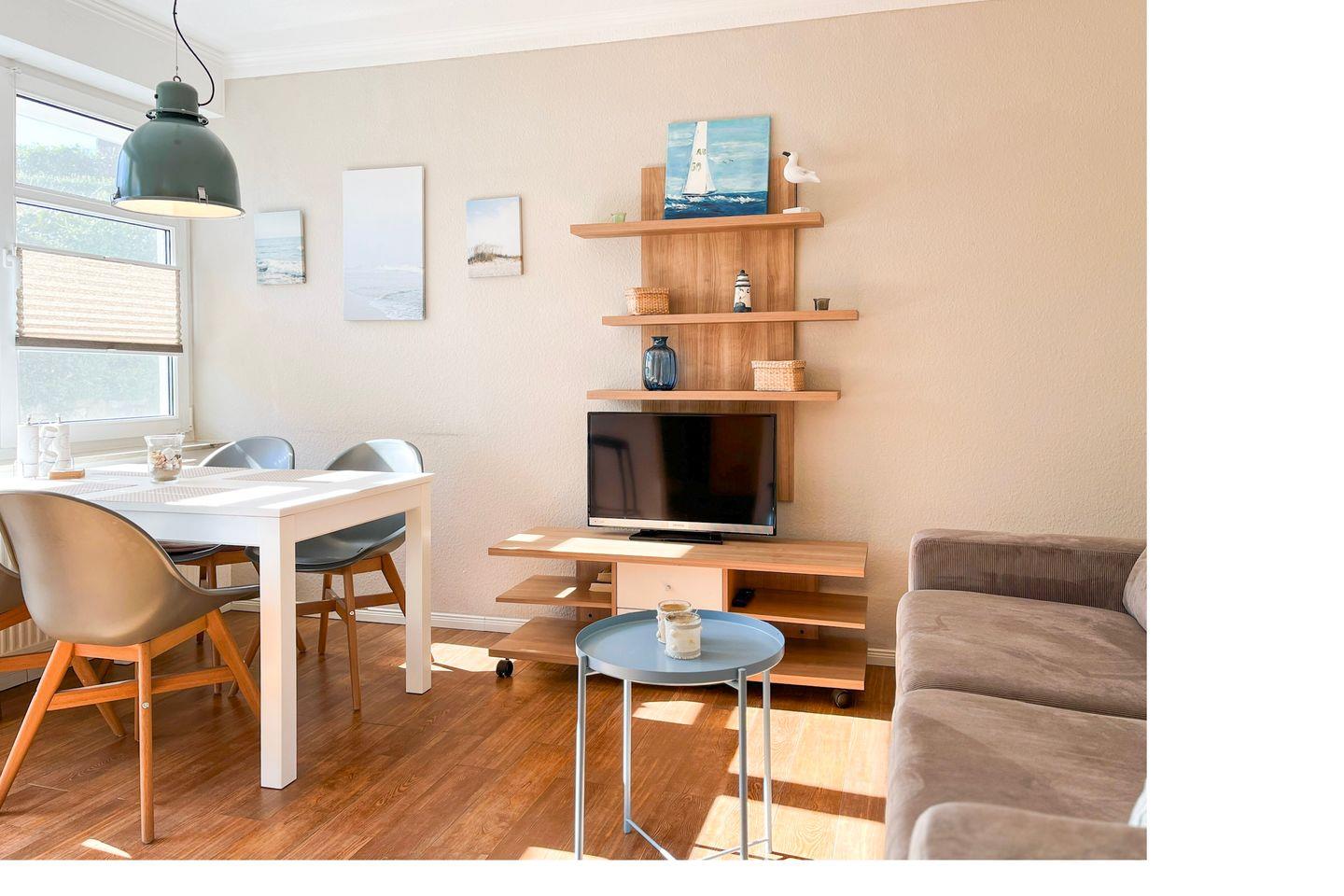 Dein Apartment liegt im Erdgeschoss des Hauses und verfügt über eine Süd-West Terrasse. Zur Wohnung mit einer Fläche von 45 m² gehören ein Wohn- und Essbereich mit offener Küche, ein Schlafzimmer und ein Duschbad. Zum Strand sind es nur ca. 100 m.
