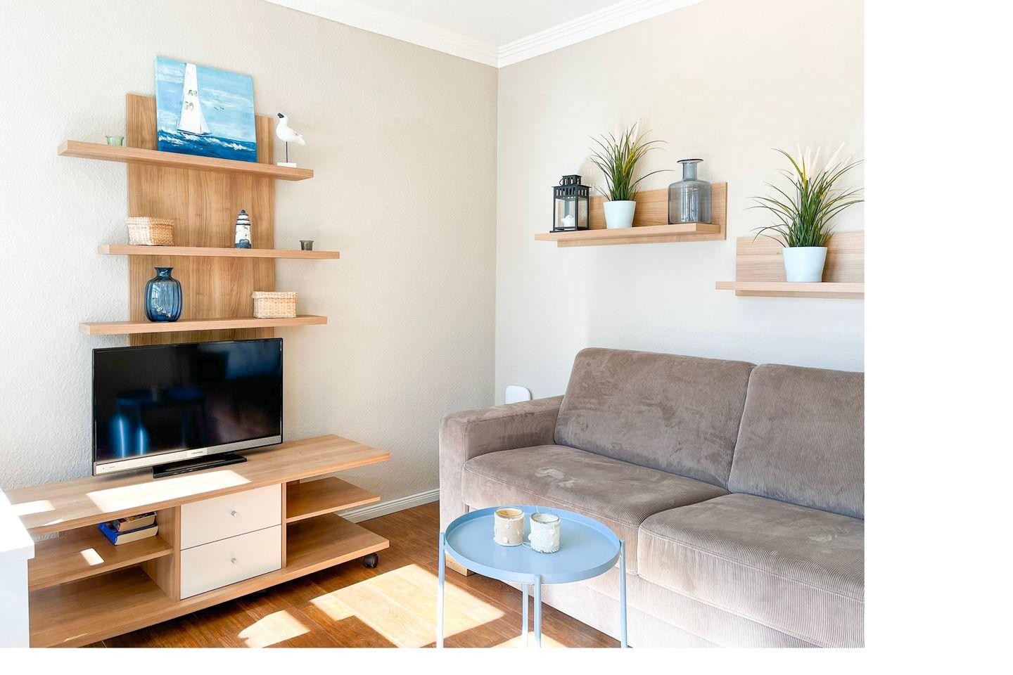 Vom Wohnzimmer aus betrittst du die möblierte Terrasse. Der Wohnbereich ist mit einer Sitzgruppe und einem Essplatz eingerichtet. Ein Flachbild-TV und ein Radio sorgen für Unterhaltung. Ausgezogen bietet das Schlafsofa (120 x 200 cm) einen Schlafplatz für eine Person.