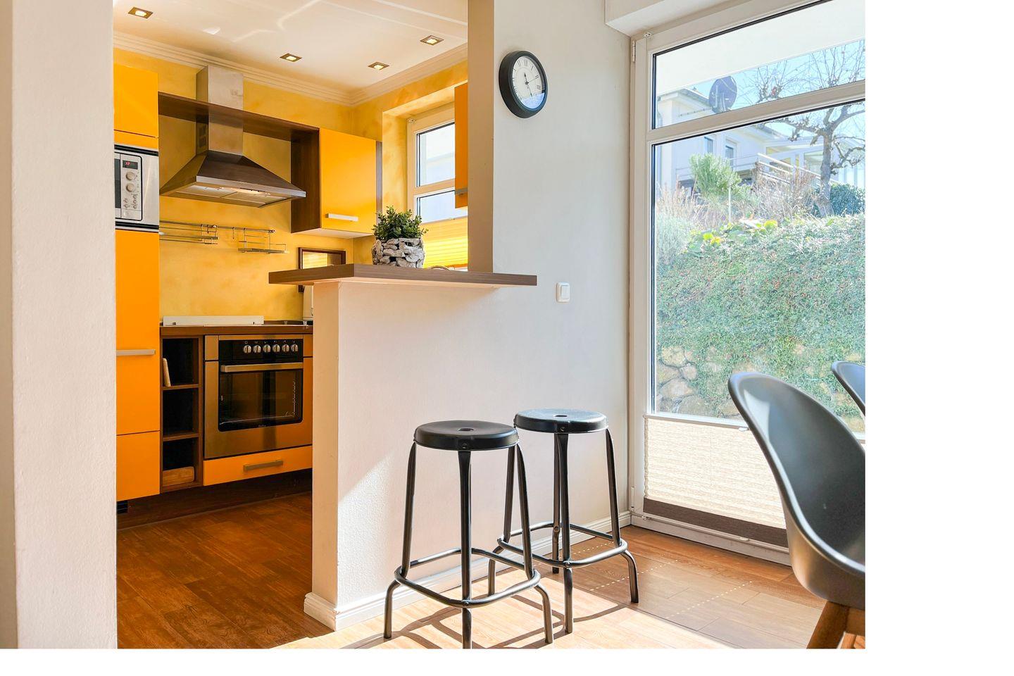 Die offene Küche bietet dir einen Geschirrspüler, einen Backofen, ein 4-Platten-Cerankochfeld, eine Mikrowelle und einen Kühlschrank mit Gefrierfach. Als Bodenbelag wurden Fliesen gewählt. Zusätzlichen Stauraum schafft ein geräumiger Kleiderschrank im Wohnbereich.
