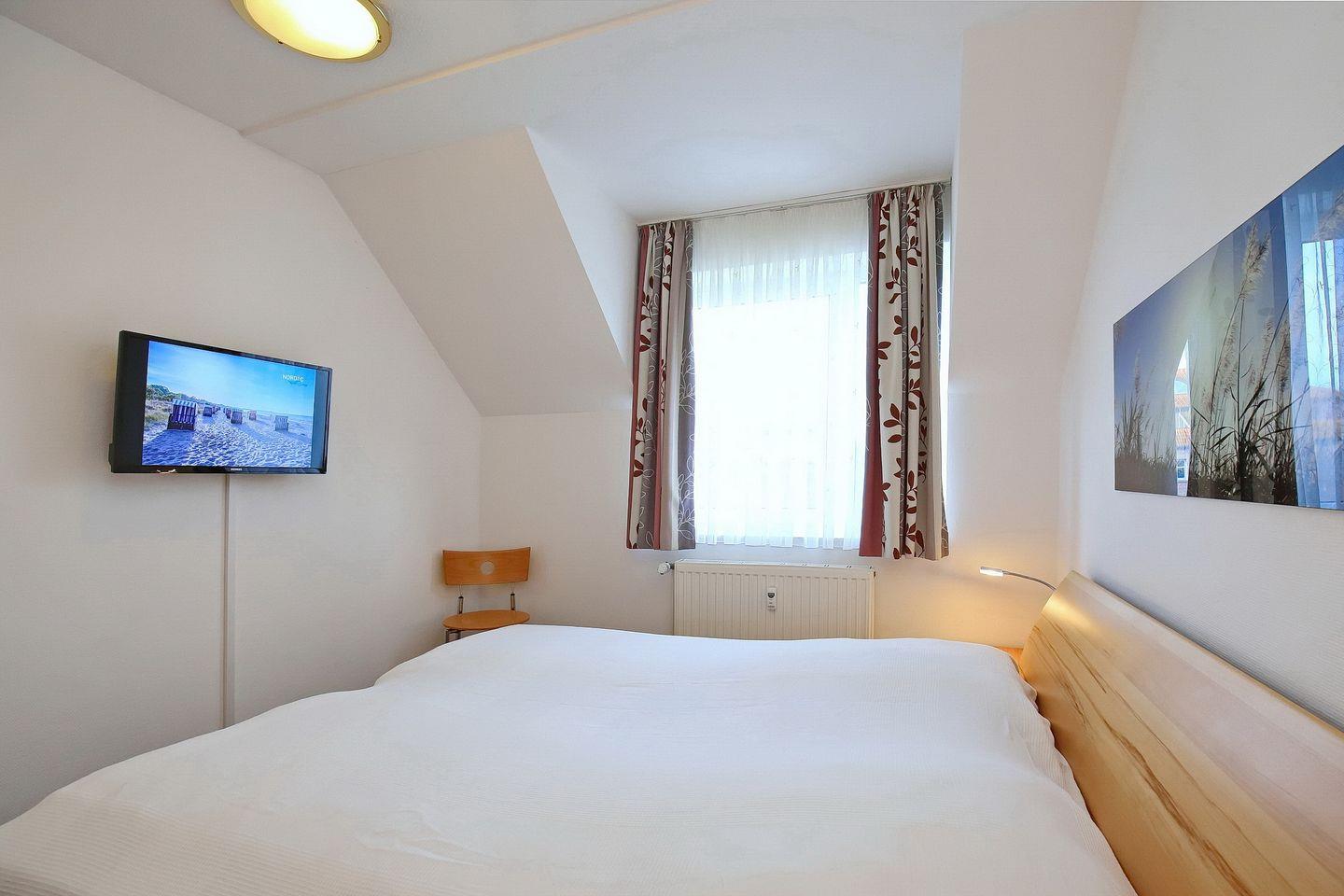 Das separate Schlafzimmer verfügt über ein Doppelbett (2 x 90 x 200 cm) und einen Kleiderschrank mit viel Stauraum für deine Urlaubsgarderobe sowie über lichtdichte Vorhänge. Weiterhin sorgt ein Flachbild-TV für Unterhaltung. Außerdem ist hier genügend Platz, um ein Kinderreisebett aufzustellen. In diesem Objekt sind maximal zwei Haustiere erlaubt!
