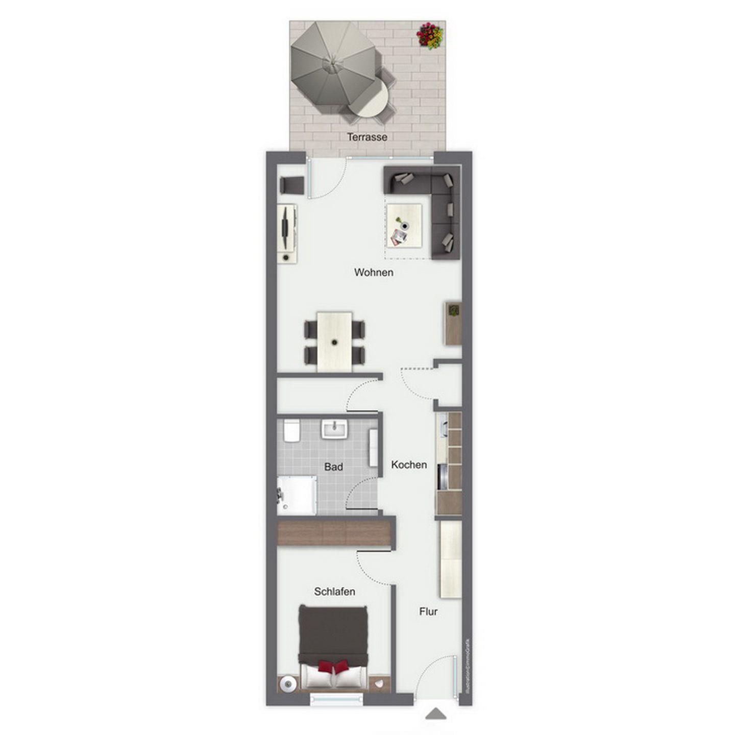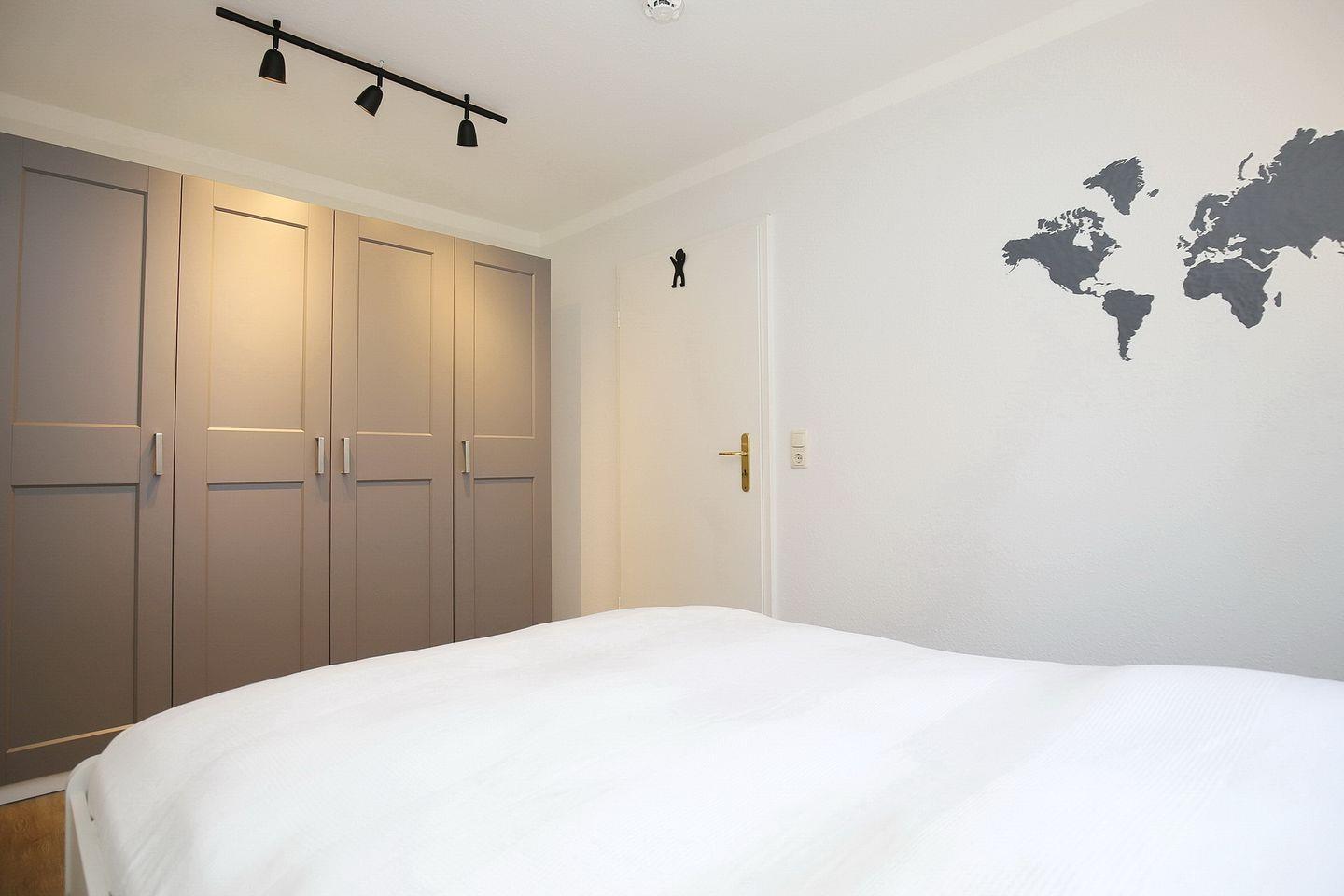 Einen erholsamen Schlaf verschafft dir ein gemütliches Doppelbett (80 x 200 cm) im Schlafzimmer. Ein Kleiderschrank im Schlafraum dient dir als Ablagemöglichkeit. Die Fenster werden mit Plissees und Verdunklungsvorhängen abgedunkelt. Zusätzlich ist ein Fliegengitter angebracht.