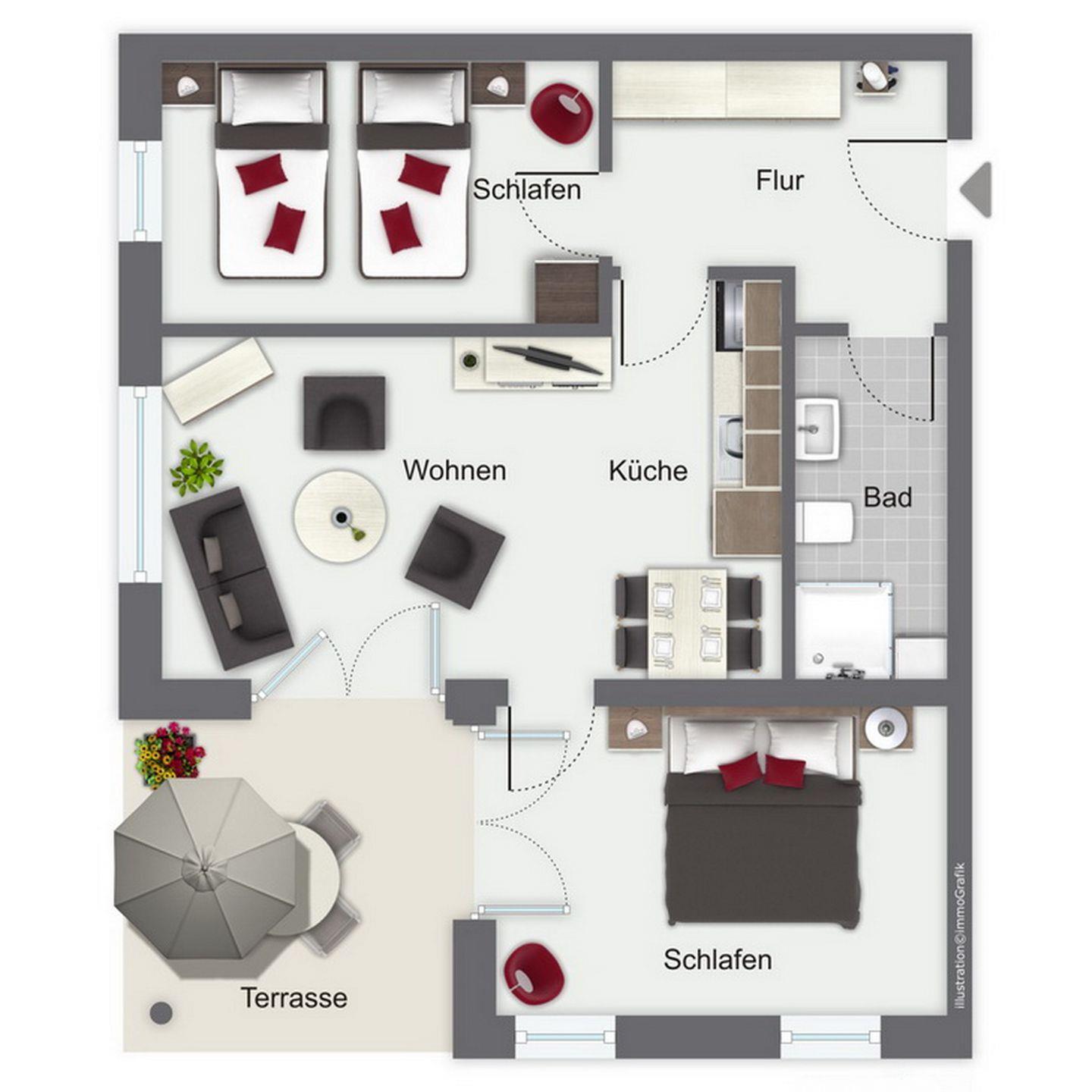 Der Boden in der Ferienwohnung wurde mit Laminat verlegt. Das Duschbad und der Küchenbereich sind hell gefliest. In dieser Nichtraucherwohnung sind Haustiere nicht erwünscht. Ein Tiefgaragenstellplatz (Einfahrtshöhe 2,10 m) sorgt für die sichere Unterbringung Ihres Autos.