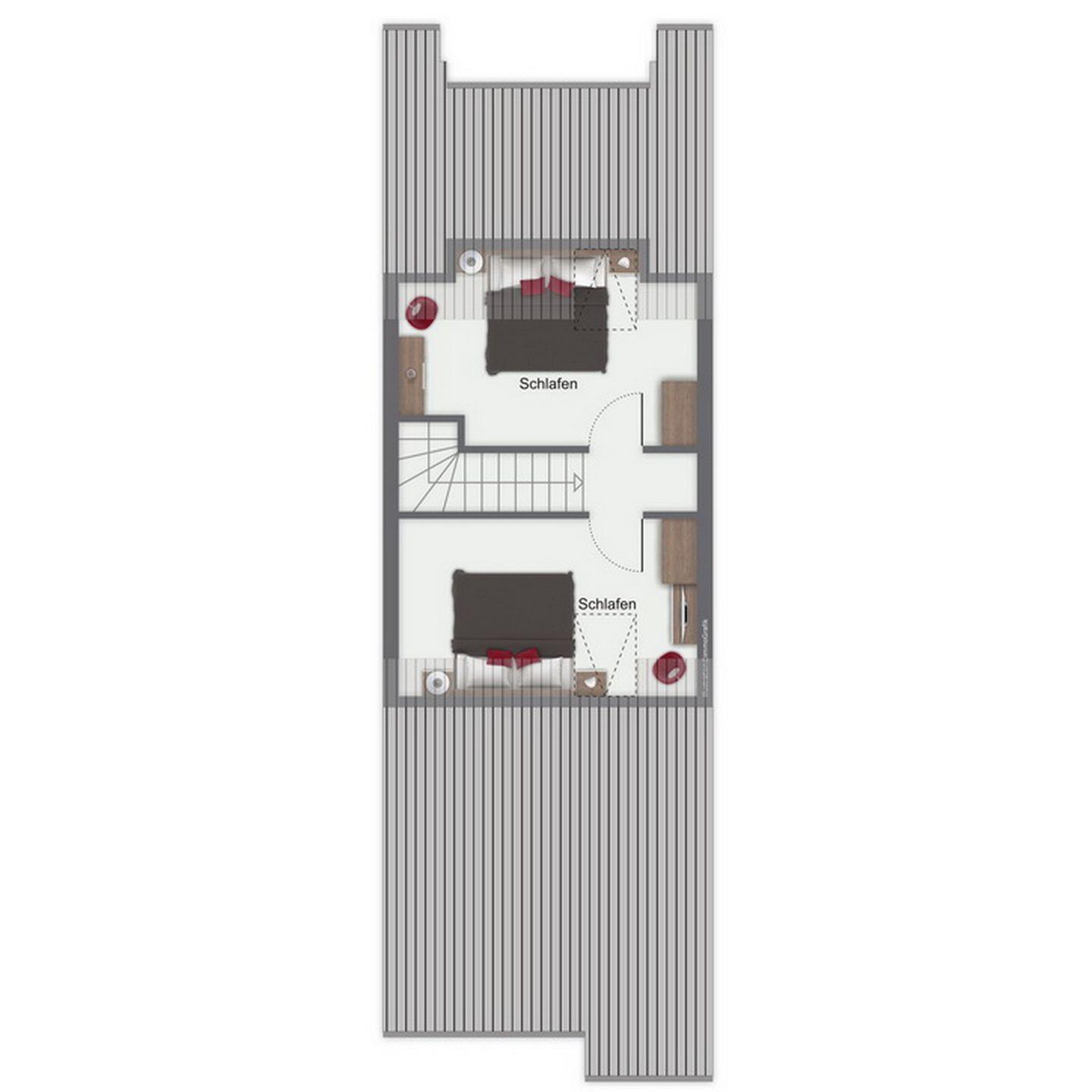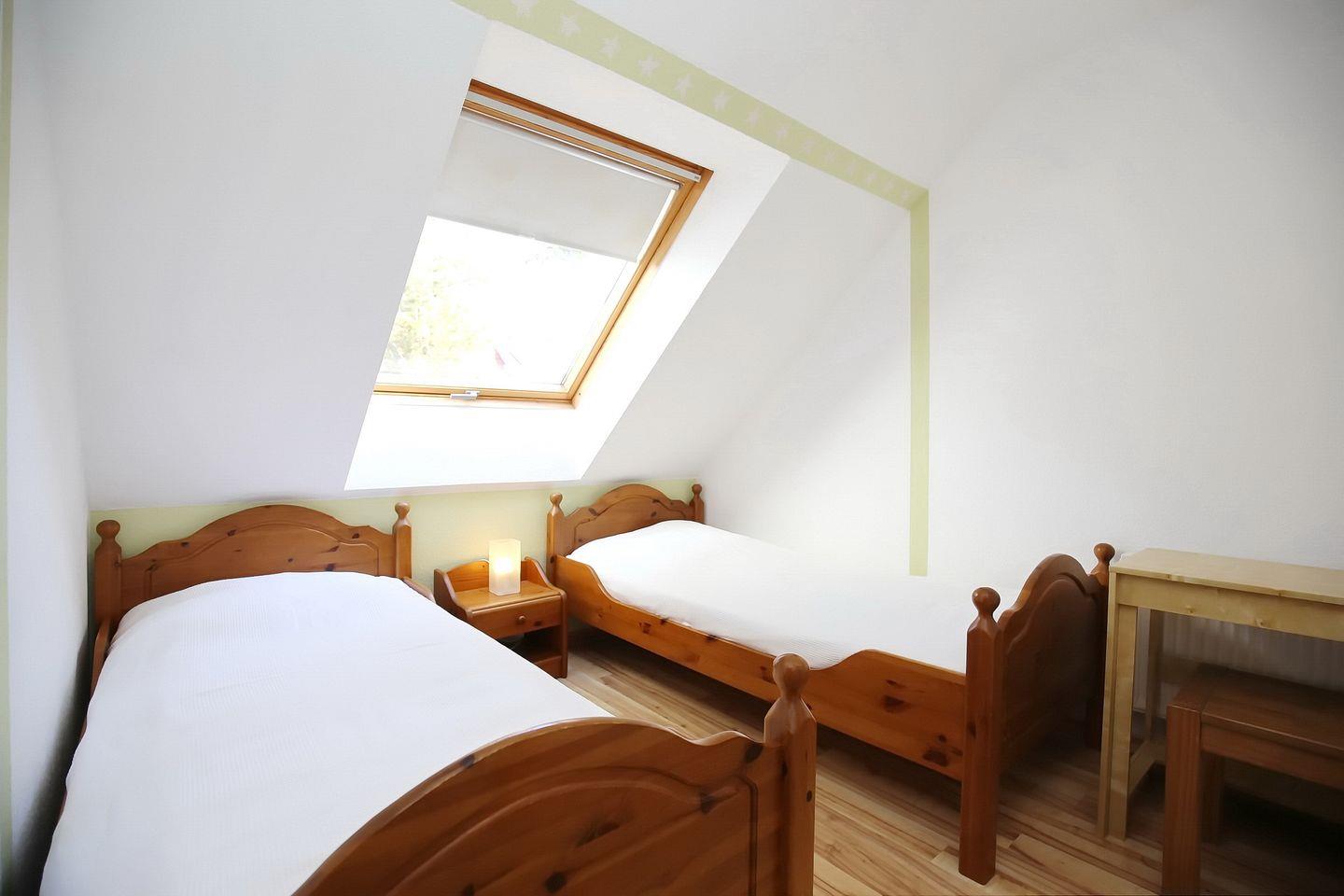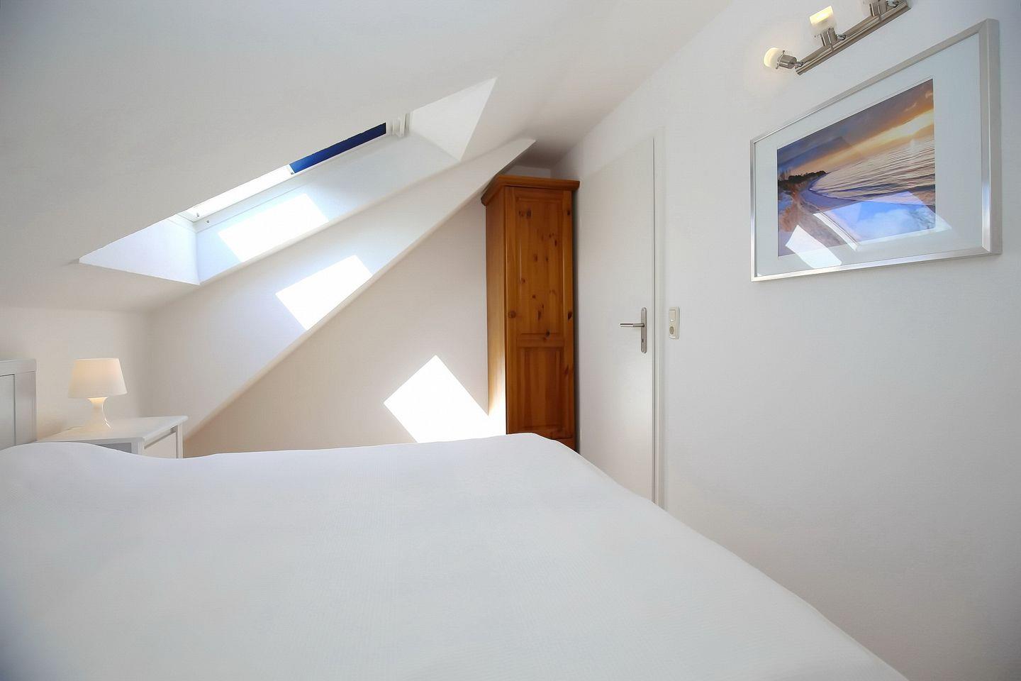 Das Schlafzimmer im 1. OG ist mit zwei Einzelbetten (2 x 90 x 200 cm) und einem Kleiderschrank ausgestattet. Beide Schlafzimmer im Dachgeschoss sind mit jeweils einem Doppelbett (2 x 90 x 200 cm und 2 x 80 x 200 cm) sowie einem Kleiderschrank eingerichtet. Zur Verdunkelung befinden sich Vorhänge bzw. Rollos an den Fenstern. Ein Kinderreisebett gehört zur Ausstattung der Wohnung.
