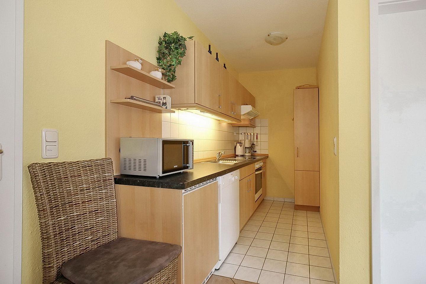 Die Ausstattung der Küchenzeile ist ein 4-Platten-Cerankochfeld mit Backofen, ein Geschirrspüler, ein Kühlschrank mit Gefrierfach und eine Mikrowelle.