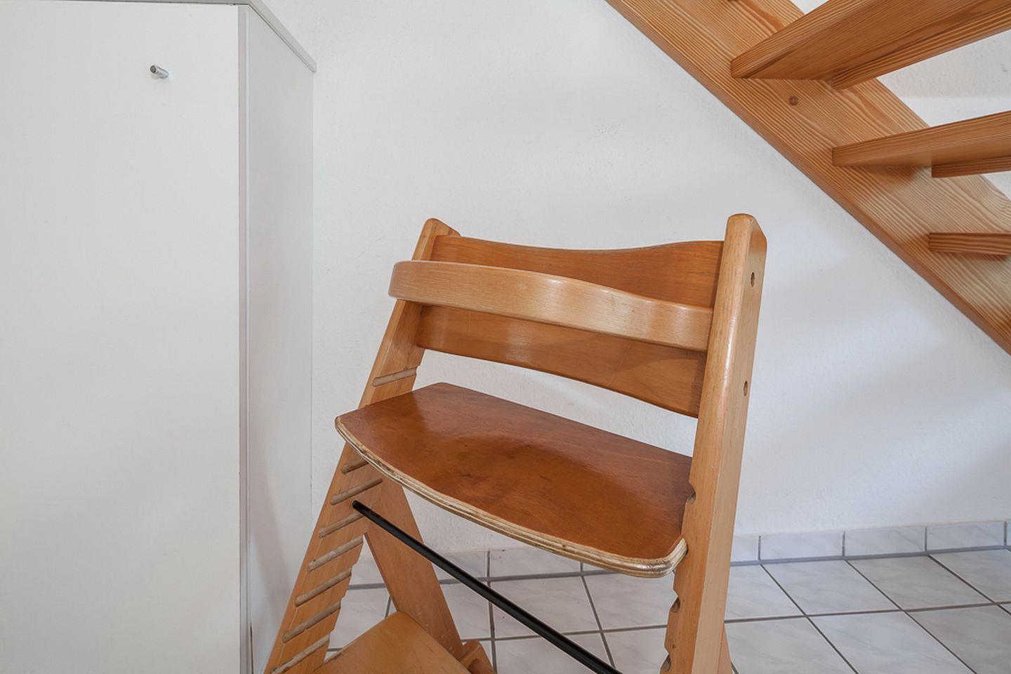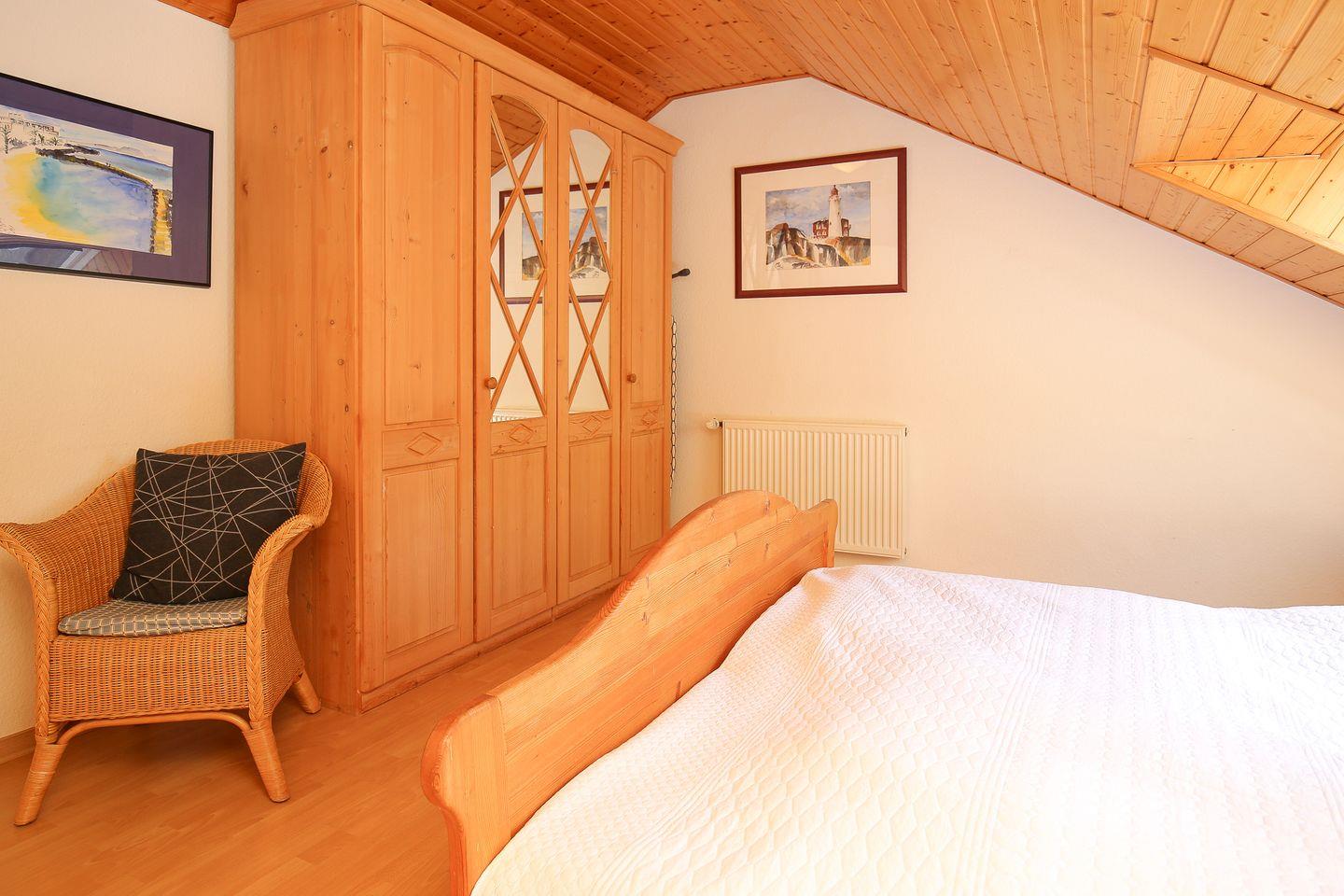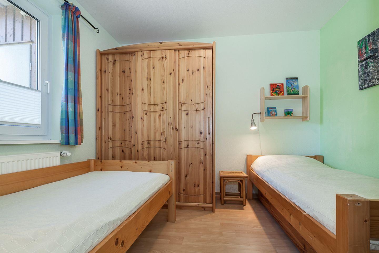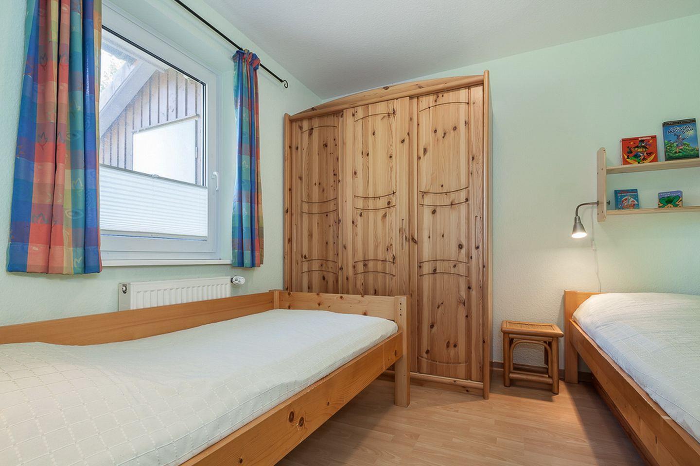 In diesem Ferienhaus stehen dir zwei Schlafzimmer zur Verfügung. Das Schlafzimmer im Erdgeschoss bietet zwei Einzelbetten (je 90 x 200 cm). Im Obergeschoss befindet sich das 2. Schlafzimmer mit einem Doppelbett (2 x 90 x 200 cm). Ein zusätzlicher Fernseher steht dir hier zur Verfügung. Für die kleinen Gäste stehen ein Kinderbett mit separater Kinderbettmatratze und ein Hochstuhl bereit. Außerdem kann ein Bollerwagen (ohne Rechtsanspruch) genutzt werden.