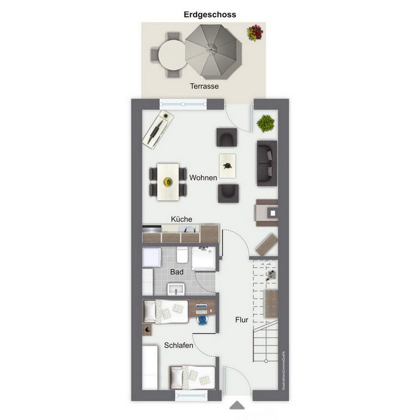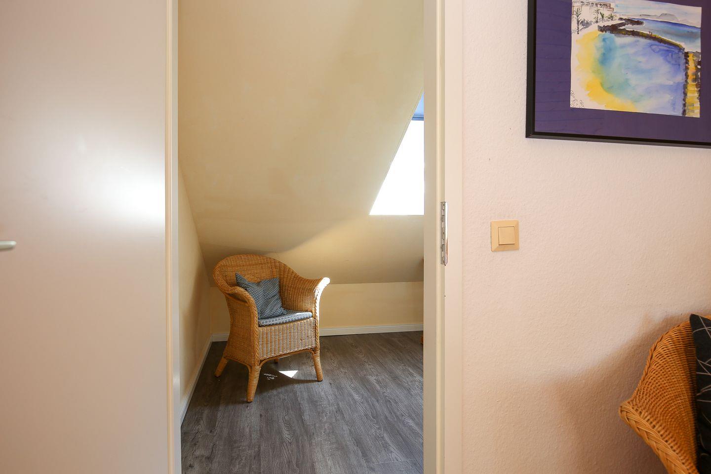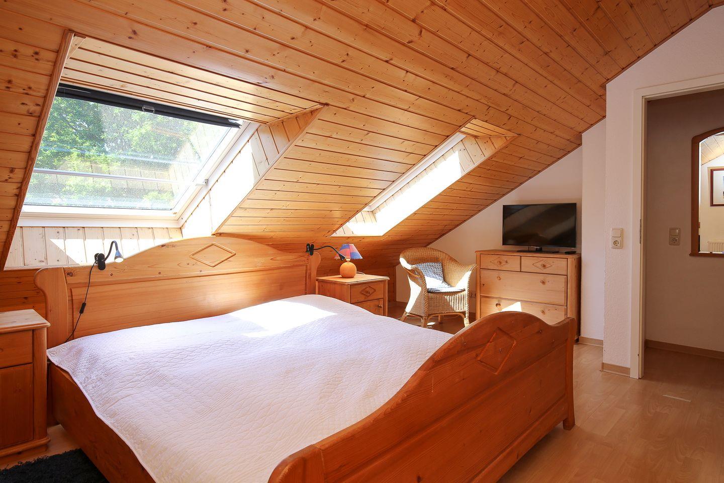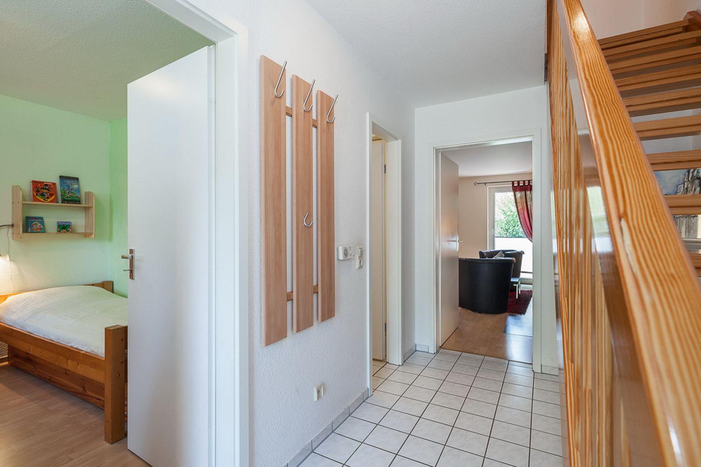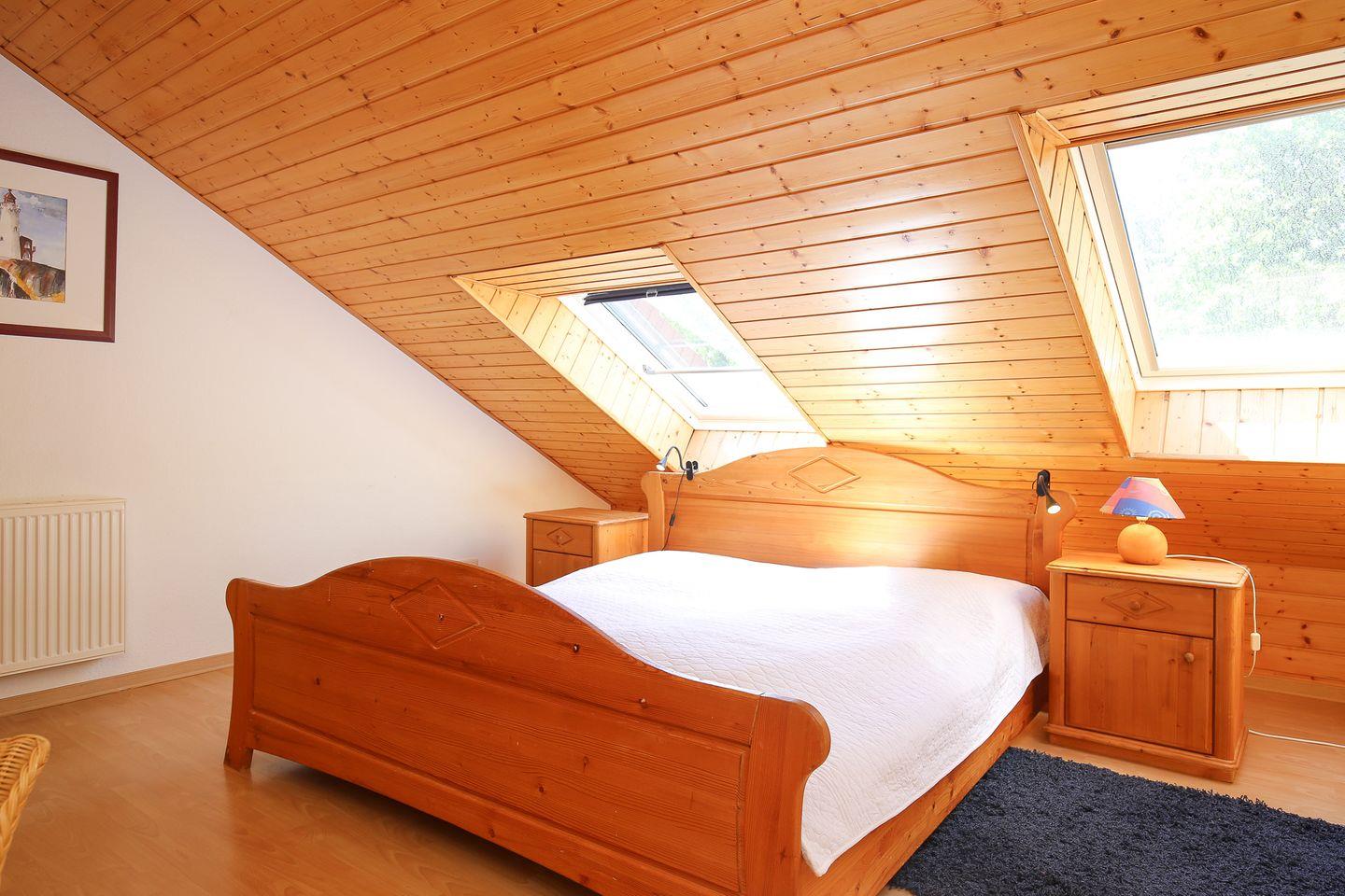 In diesem Ferienhaus stehen dir zwei Schlafzimmer zur Verfügung. Das Schlafzimmer im Erdgeschoss bietet zwei Einzelbetten (je 90 x 200 cm). Im Obergeschoss befindet sich das 2. Schlafzimmer mit einem Doppelbett (2 x 90 x 200 cm). Ein zusätzlicher Fernseher steht dir hier zur Verfügung. Für die kleinen Gäste stehen ein Kinderbett mit separater Kinderbettmatratze und ein Hochstuhl bereit. Außerdem kann ein Bollerwagen (ohne Rechtsanspruch) genutzt werden.