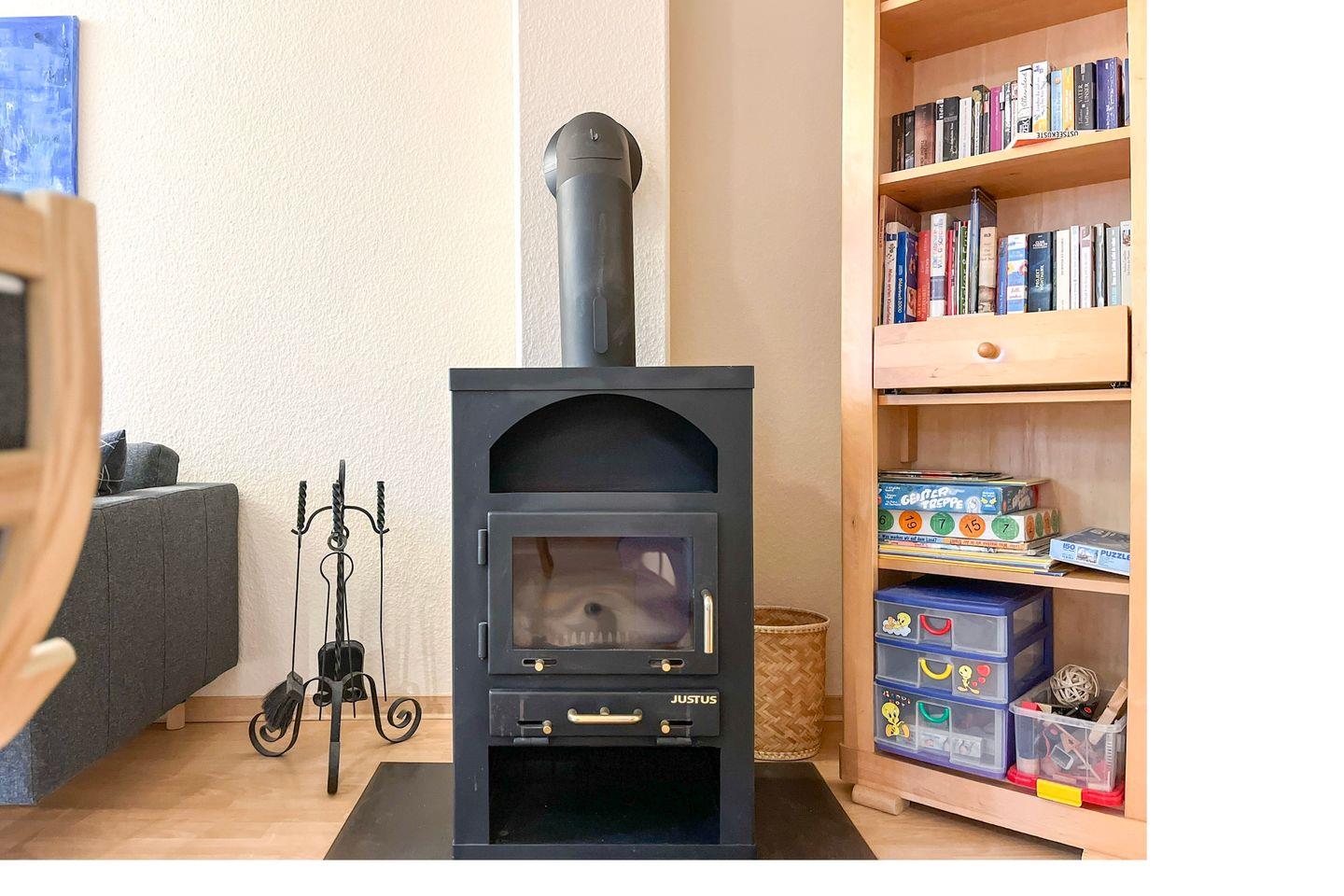 Im Erdgeschoss befindet sich das Wohnzimmer mit dem Essbereich in unmittelbarer Nähe der Küchenzeile. Vier Personen können sich hier in gemütlicher Runde den kulinarischen Genüssen hingeben. An kühlen Tagen kannst du am Kamin romantische Stunden verbringen. Eine ausziehbare Doppelschlafcouch (120 x 180 cm) bietet Platz für zwei Gäste. Des Weiteren gibt es in diesem Ferienhaus einen Flatscreen-TV und eine Stereoanlage für deine Unterhaltung. Eine kleine Auswahl an Lektüre steht dir zur Verfügung.