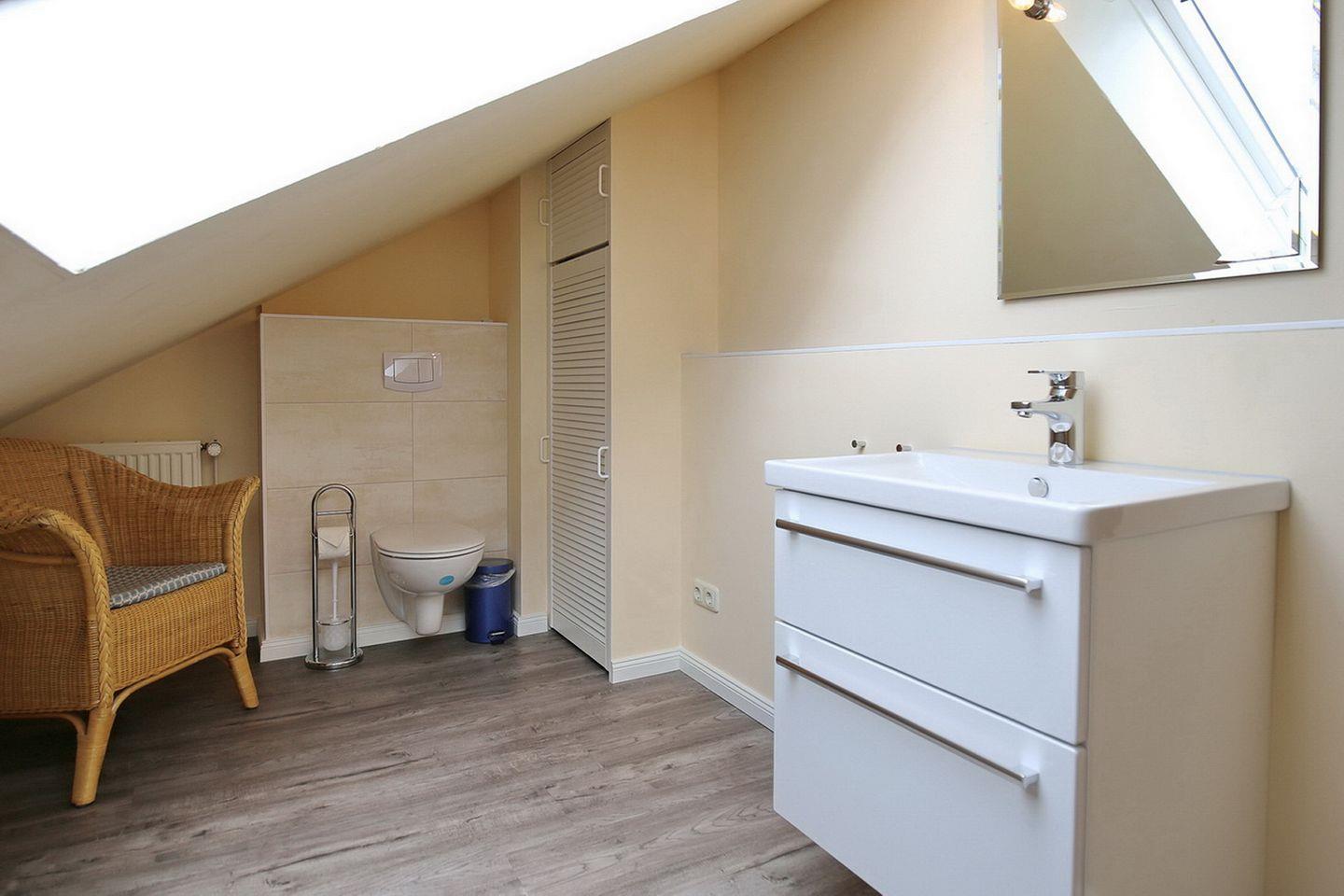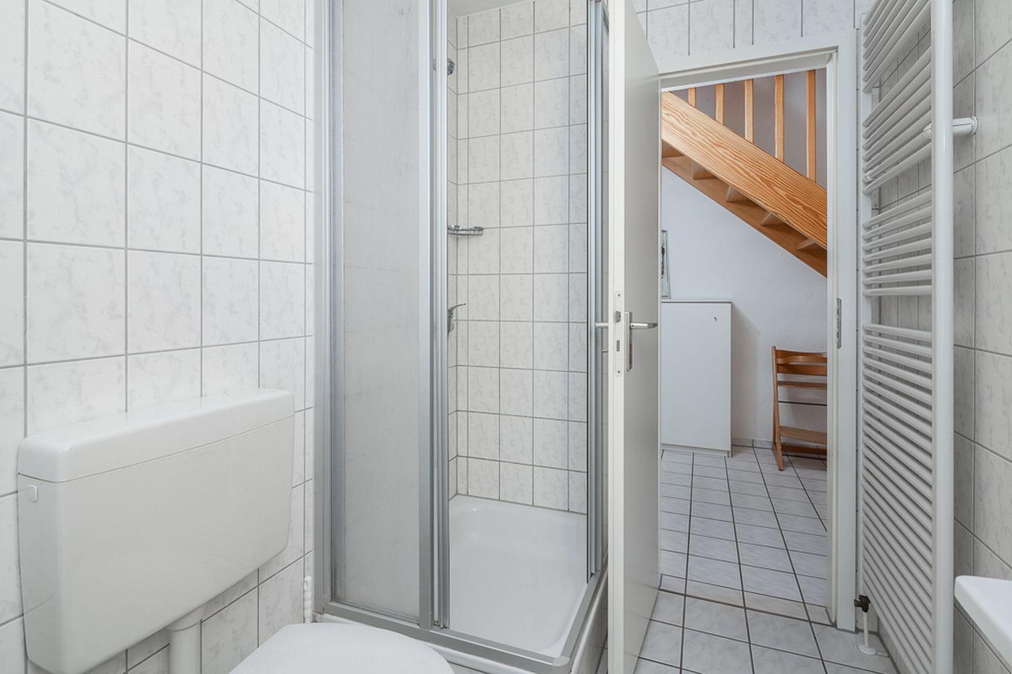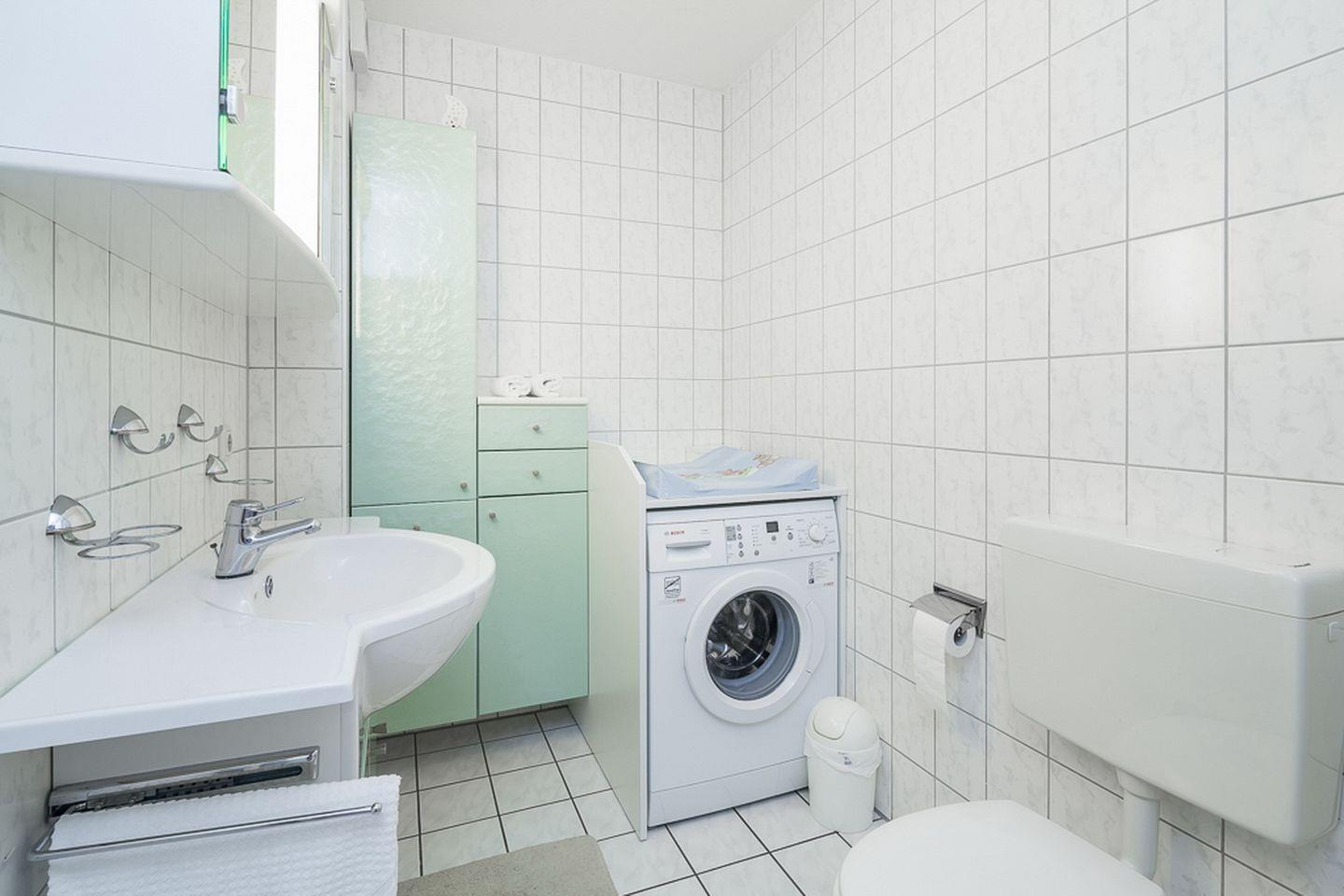Das Ferienhaus bietet im Erdgeschoss ein gefliestes Duschbad mit Waschmaschine und Wickelauflage und im Obergeschoss ein zusätzliches Gäste-WC.