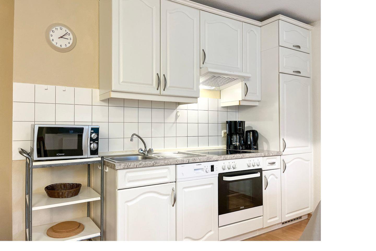 In den Wohnbereich integriert ist eine hochwertige Einbauküche, die über einen Geschirrspüler, Kühlschrank mit Gefrierfach, Herd mit einem 4-Platten-Cerankochfeld und Backofen sowie viele diverse Extras verfügt.