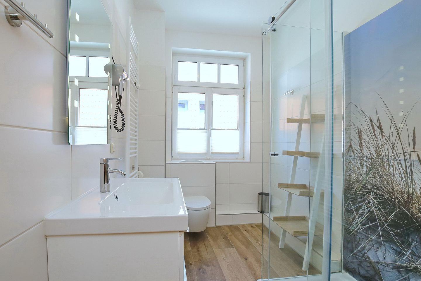 Die Ferienwohnung hat ein gefliestes Bad mit begehbarer Dusche. Bei dieser Ferienwohnung handelt es sich um eine Nichtraucherwohnung, maximal zwei Haustiere sind hier aber willkommen.