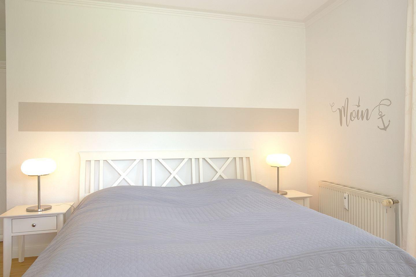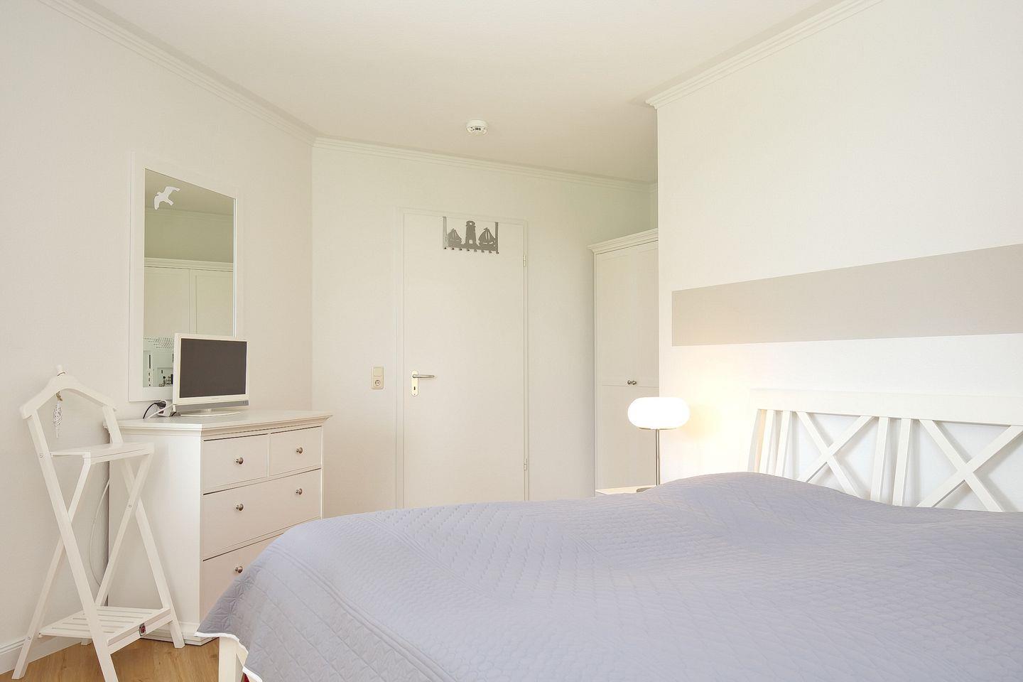 Das Schlafzimmer ist mit einem großen Doppelbett (2 x 90 x 200) und einer Kommode ausgestattet. Ein zweiter Flachbild- TV bietet die Möglichkeit für ein zusätzliches Fernsehvergnügen. Verdunklungsvorhänge und Insektenschutz an den Fenstern garantieren einen ruhigen und erholsamen Schlaf.