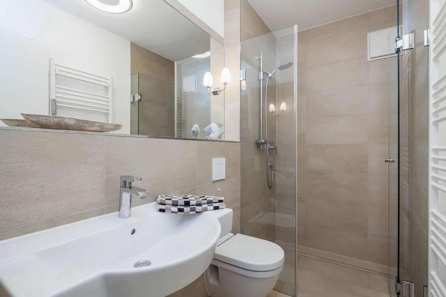 Das hellgeflieste Duschbad ist mit einer ebenerdigen Glasdusche und einem Waschtisch ausgestattet. Als Bodenbelag wurde im Wohnzimmer ein Design-Belag verlegt.
