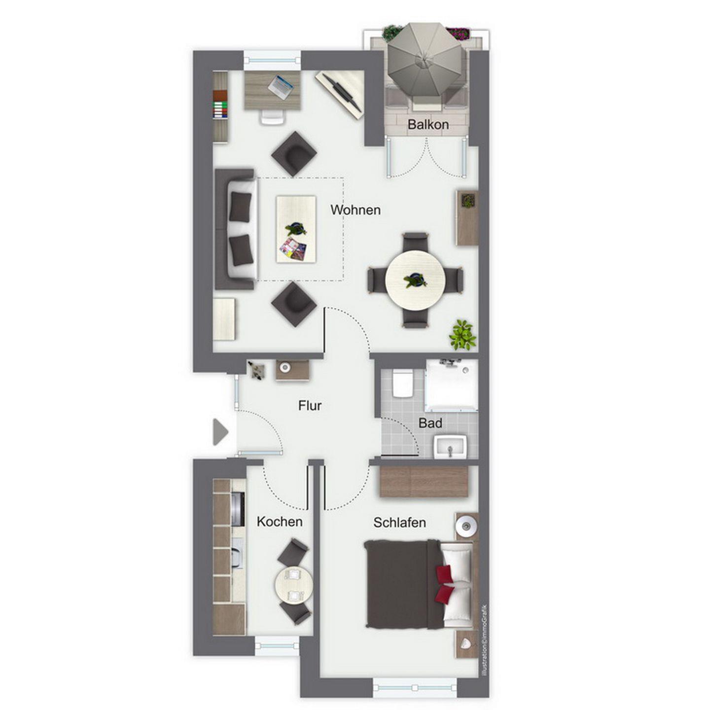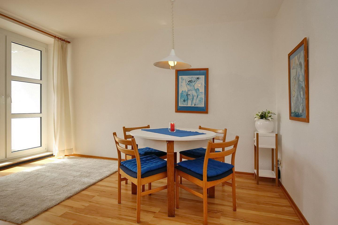 Diese 2 Zimmerwohnung liegt im 1. OG, hat eine separate voll ausgestattete Küche, in der auch eine Waschmaschine genutzt werden kann. Der zur Wohnung gehörende Balkon ist südlich ausgerichtet. WLAN (ohne Gewähr) inklusive.