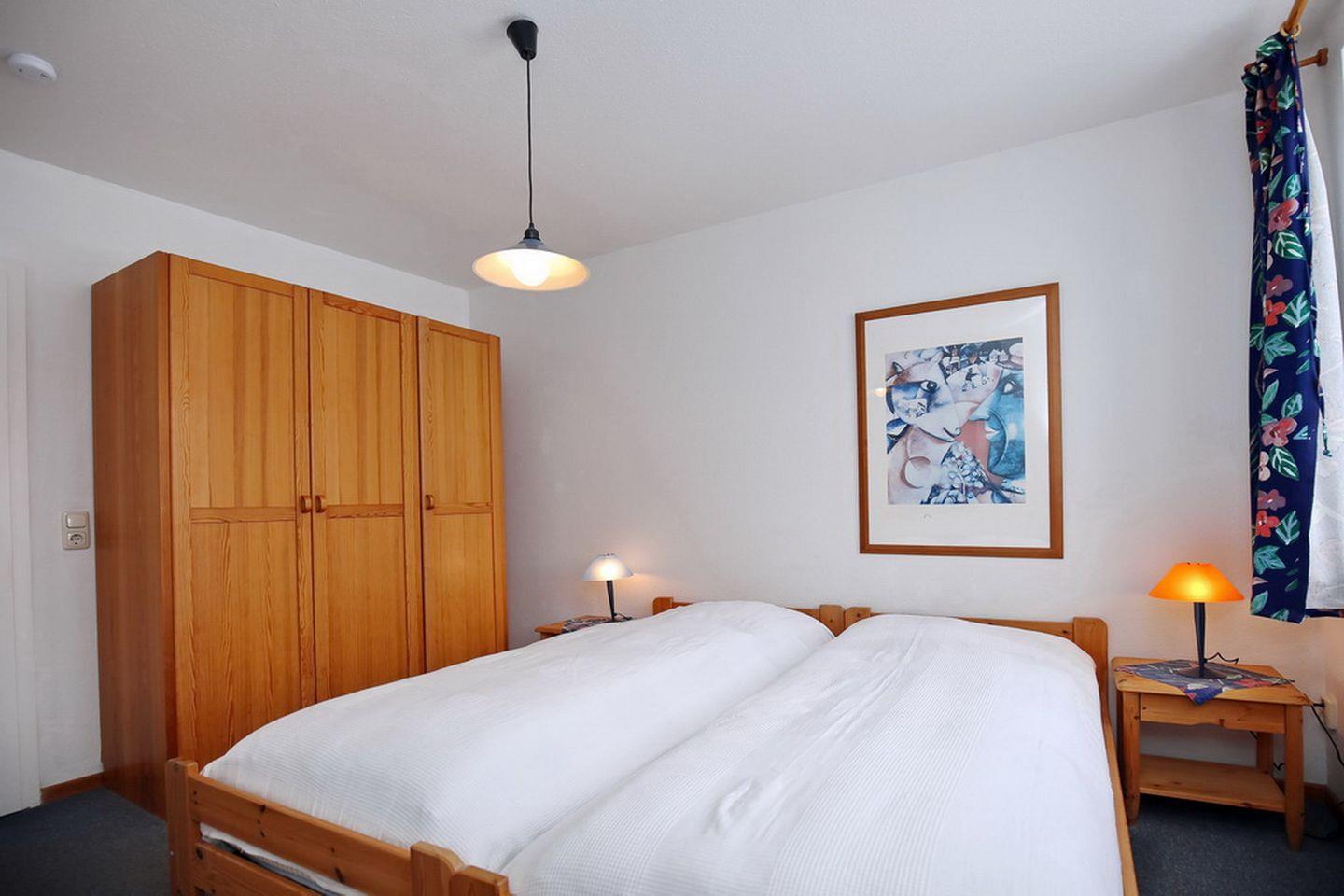 Das Schlafzimmer ist mit einem Doppelbett (2 x 90 x 200 cm) und einem geräumigen Kleiderschrank gestaltet. An den Fenstern sind Vorhänge angebracht. Als Bodenbelag wurde im Schlafraum Teppich gewählt.