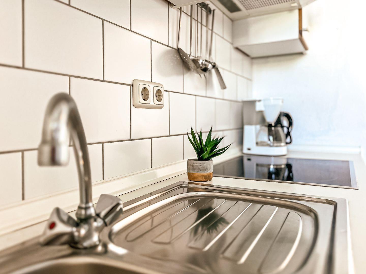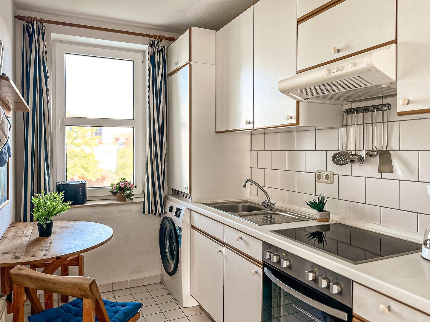 In der separaten Küche kann auch eine Waschmaschine genutzt werden. Für die Zubereitung deiner Lieblingsgerichte kannst du einem Backofen mit 4-Plattencerankochfeld, einen Kühlschrank mit Gefrierfach und weitere Küchenutensilien nutzen. Der Küchen- und Nassbereich wurde gefliest.