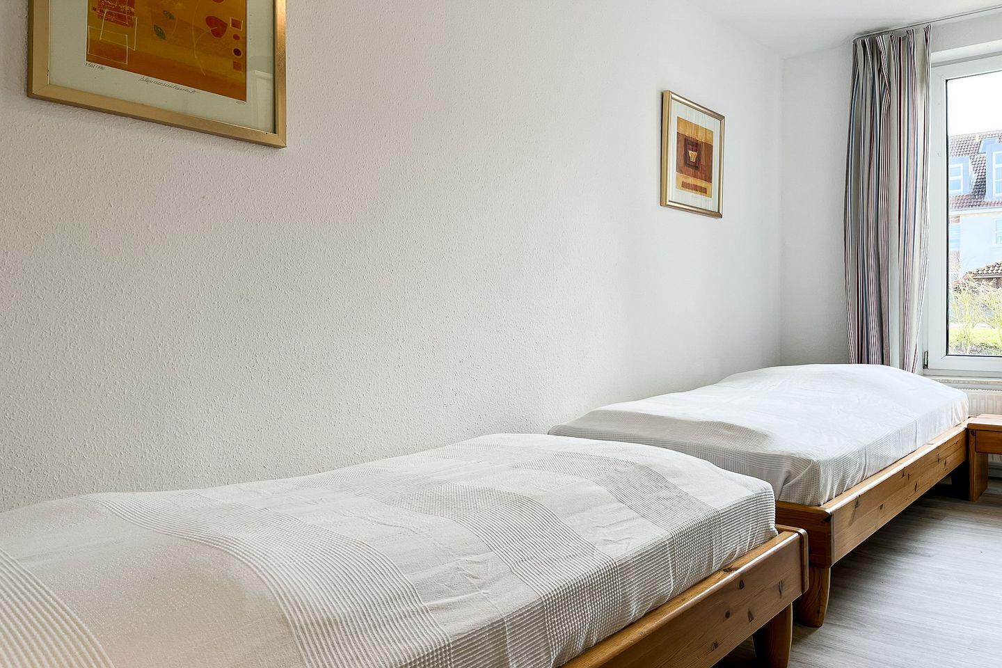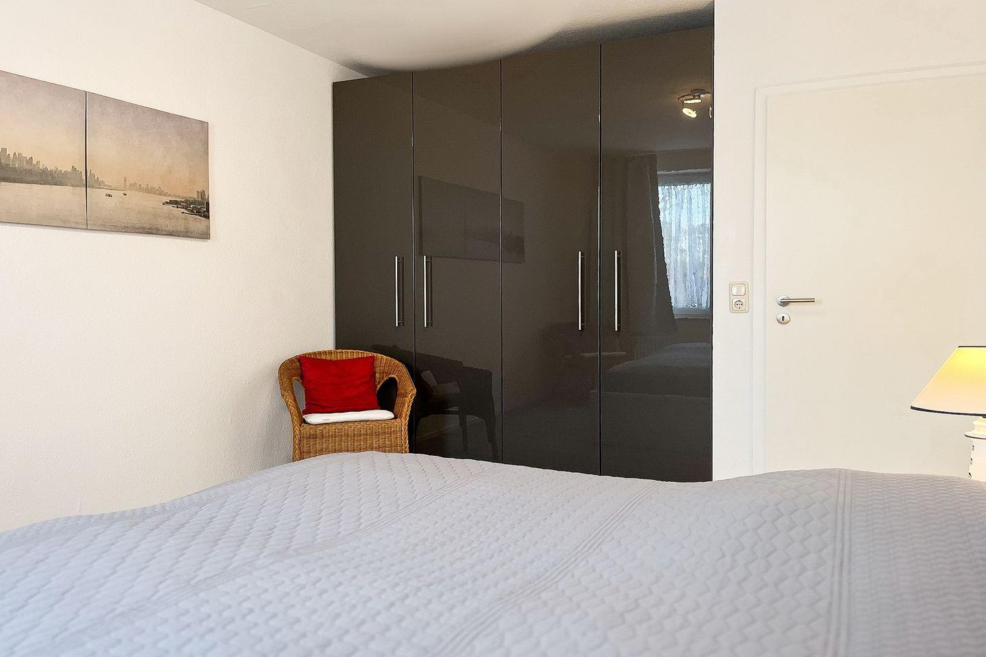 Ein großer Kleiderschrank in den beiden Schlafzimmern bietet ausreichend Platz für deine Urlaubsgarderobe. Die Schlafzimmer sind mit einem Doppelbett (2 x 90 x 200 cm) und zwei Einzelbetten (90 x 200 cm) sowie Teppichboden ausgestattet. An den Fenstern befinden sich Vorhänge zur Abdunkelung.