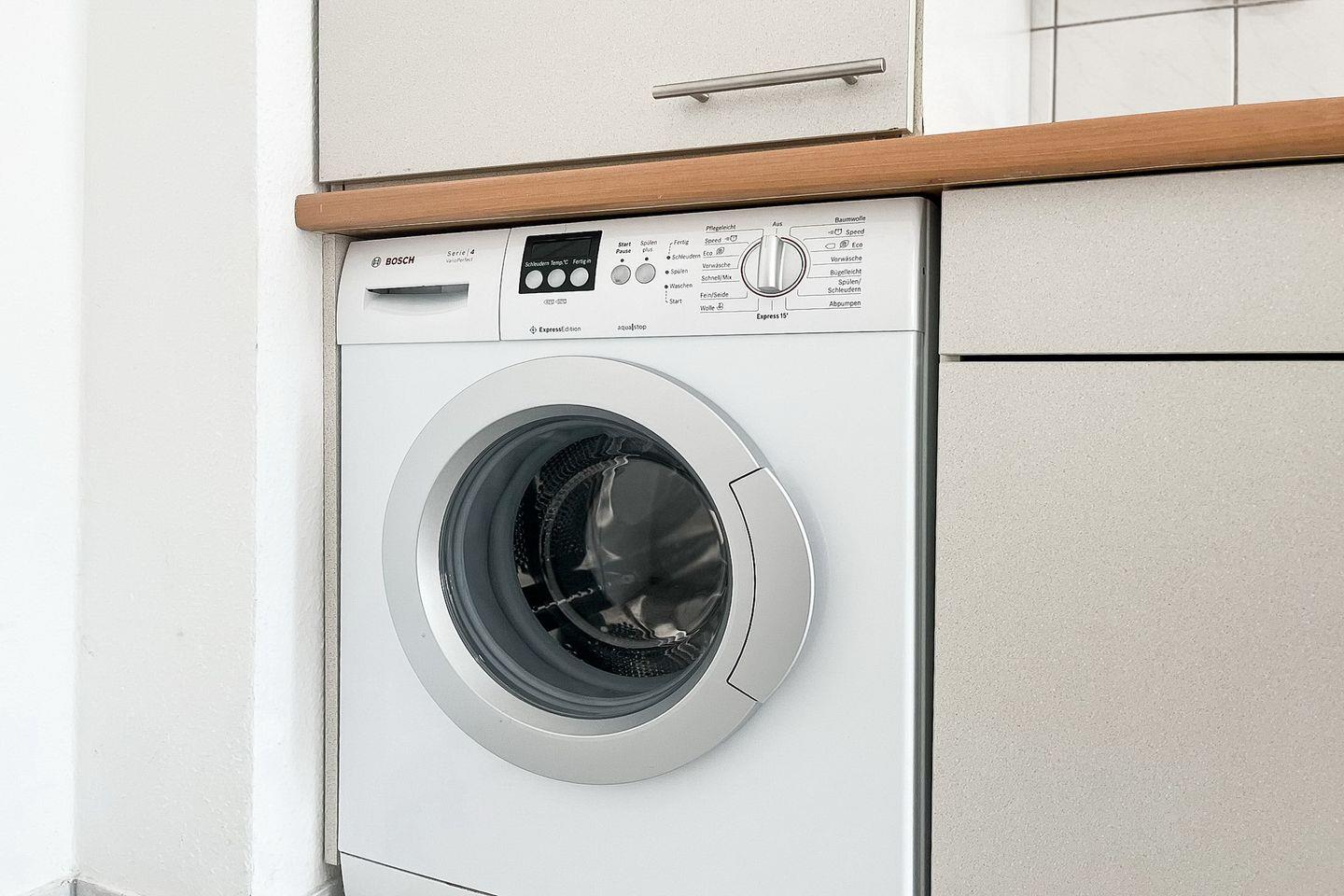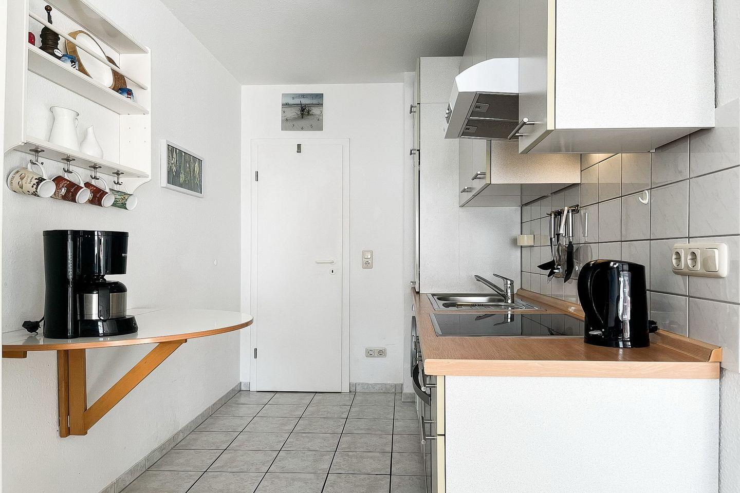Die im Wohnbereich integrierte Küchenzeile verfügt über einen Geschirrspüler, ein 4-Platten Cerankochfeld mit Backofen, einen Kühlschrank mit Gefrierfach und eine Mikrowelle. Auch eine Waschmaschine kann hier genutzt werden.