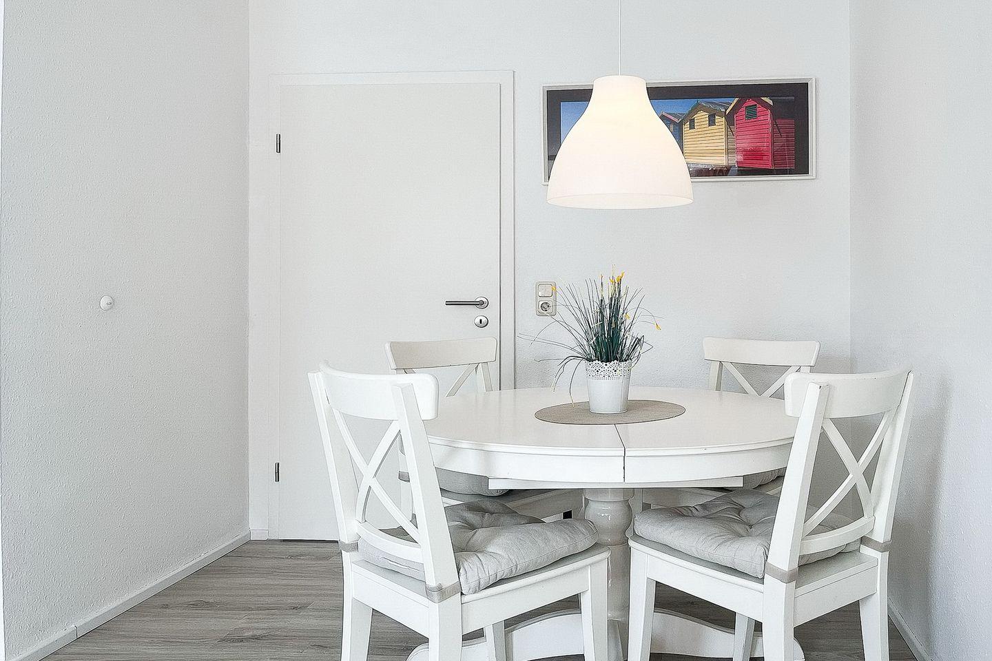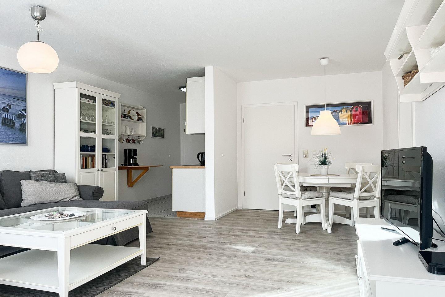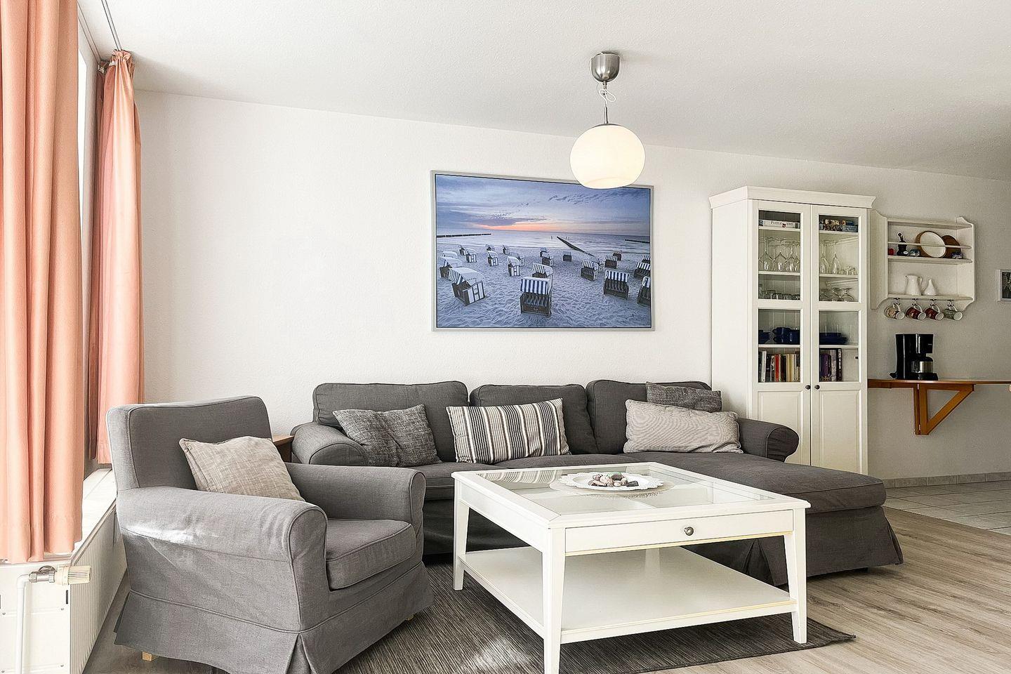 Der Wohnbereich ist mit einer bequemen Polstergarnitur und einem Essbereich für die gemeinsamen Mahlzeiten ausgestattet. Von hier aus gelangst du auch auf die süd-östlich angelegte, möblierte Terrasse. Genieße hier im eigenen Strandkorb die Sonne. Für Kurzweil sorgen ein 42" Flachbild-TV, ein Blue-Ray-Player und eine Stereoanlage. Der Bodenbelag ist Designbelag.