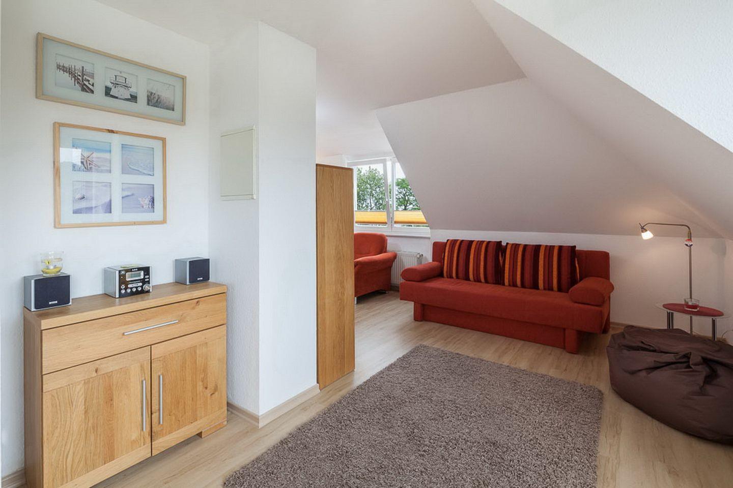 Aus dem Wohnzimmer heraus betreten Sie den möblierten Balkon, auf dem Sie die frische Ostseeluft und einen wunderschönen Seeblick genießen können. Im Wohnbereich sorgen ein Schlafsofa (160 x 200 cm) und die Essecke für einen angenehmen Aufenthalt. Zur Unterhaltung stehen ein Flachbild-TV und eine Stereoanlage bereit.