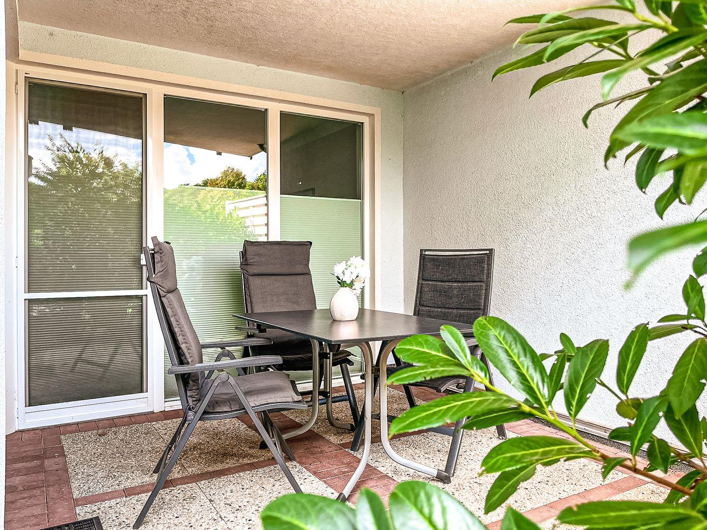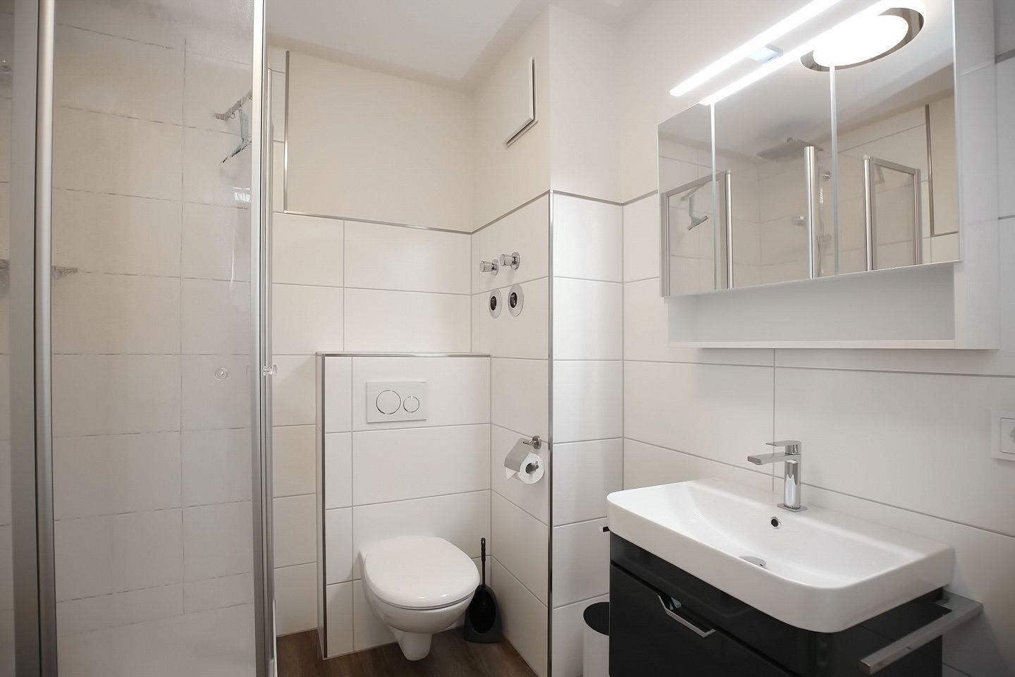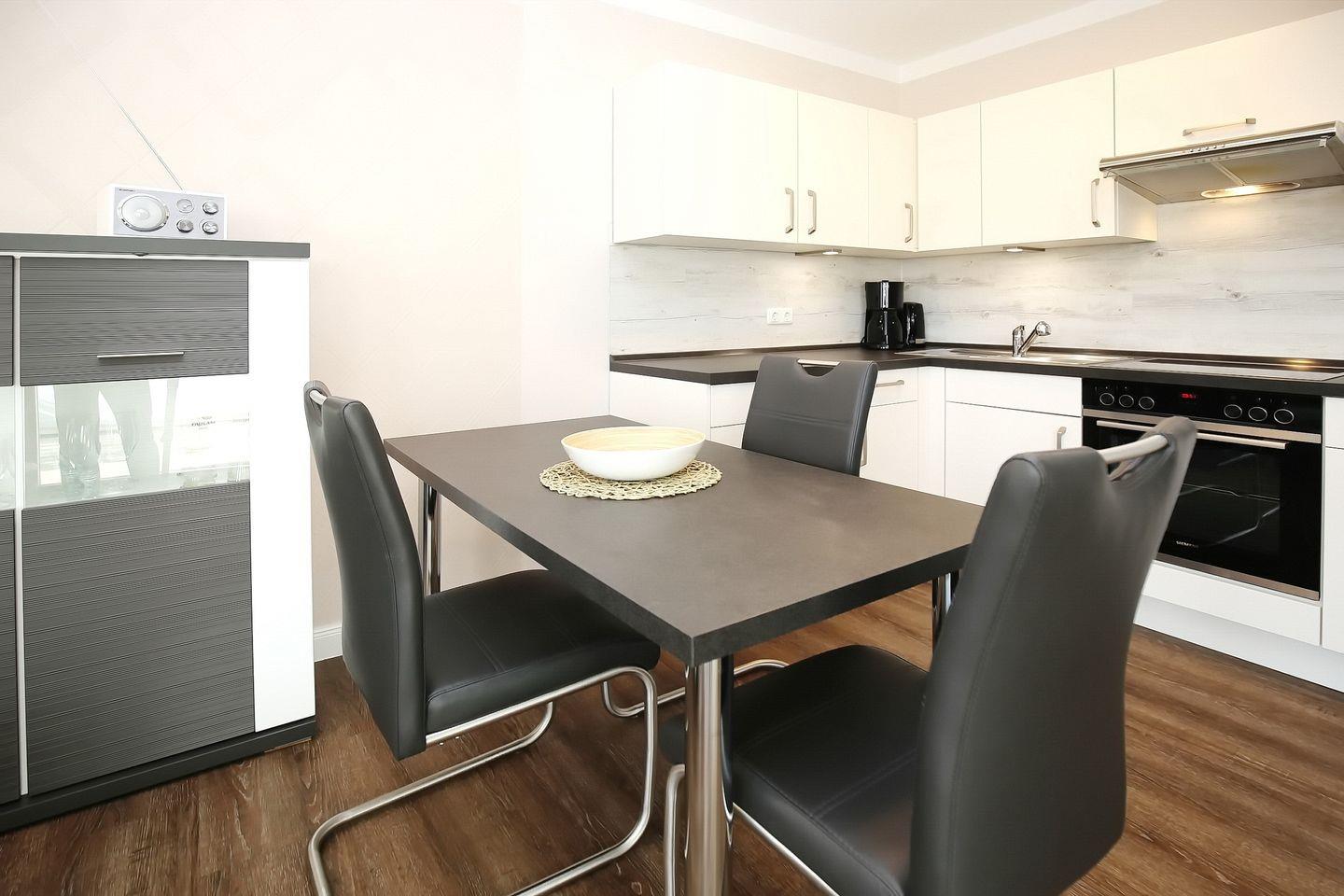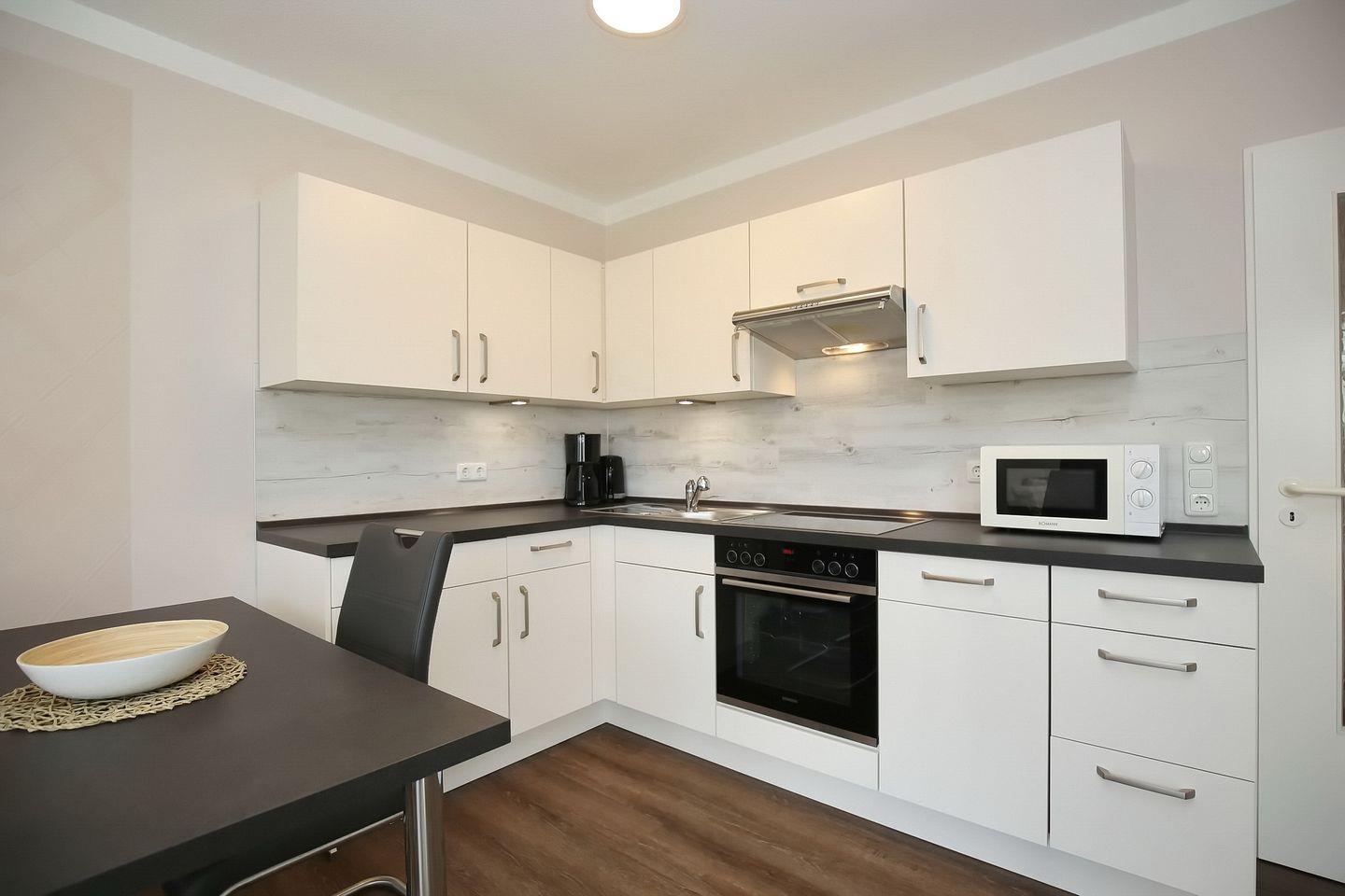 Die Küche ist in den Wohnbereich integriert und modern sowie komfortabel ausgestattet. Hier findest du einen Geschirrspüler, eine Mikrowelle, einen Kühlschrank mit Tiefkühlfach sowie einen Herd mit einem 4-Platten-Cerankochfeld. Im Bereich der Küchenzeile befindet sich ein moderner Essplatz für 4 Personen. Die gesamte Wohnung ist mit Fliesen ausgelegt. Das Bad verfügt über eine Dusche, und das WC ist freihängend.