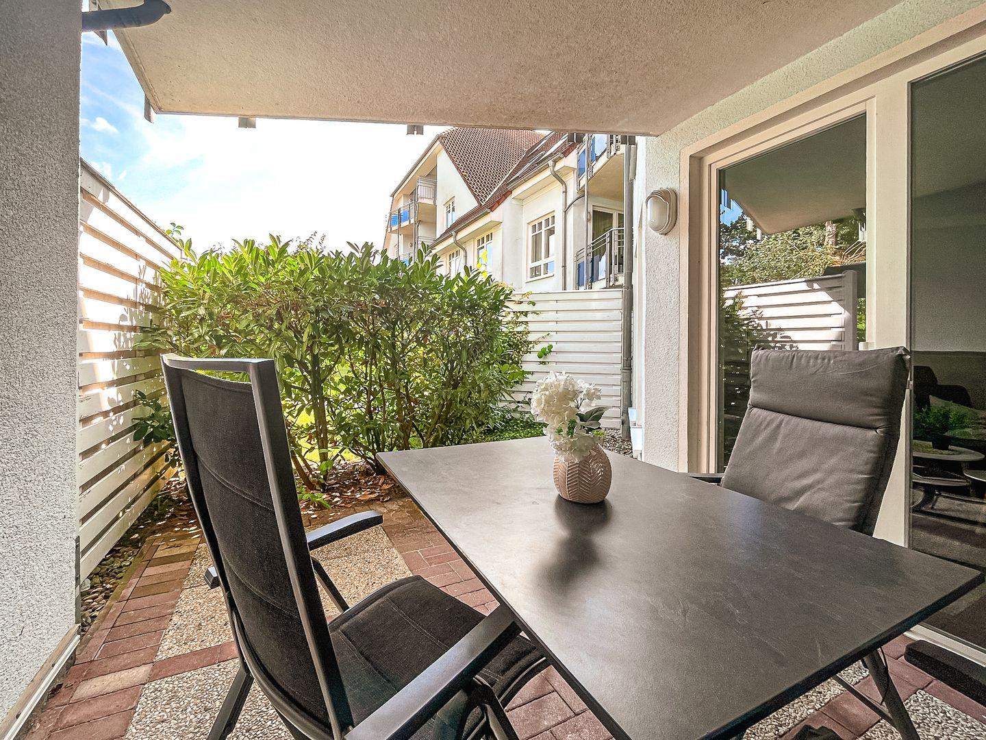 Die Ferienwohnung Nr. 8 befindet sich im Erdgeschoss und bietet dir auf ca. 50 m² ein Wohnzimmer mit Küchenzeile, ein Schlafzimmer, ein Duschbad sowie eine östlich ausgerichtete Terrasse. Zum Strand sind es nur 70 Meter.