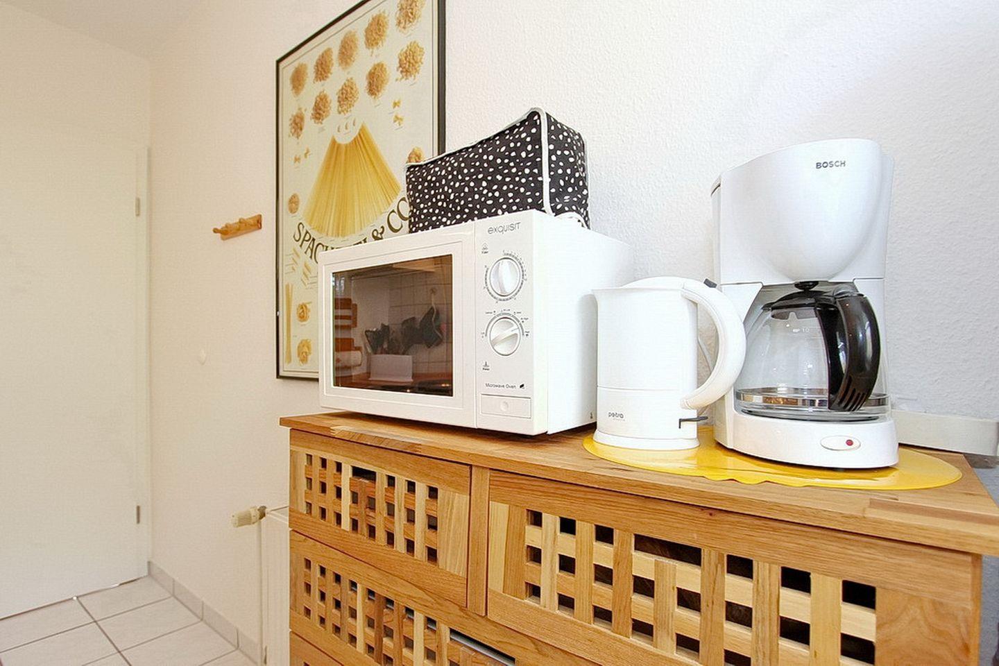 Die gut ausgestattete Küche lässt keine Wünsche offen, ob 4-Platten-Herd mit Backofen, Kühlschrank mit Gefrierfach, Geschirrspüler und Mikrowelle ausreichend Gläser und Geschirr, hier findest du alles, was du zum Kochen und Schlemmen benötigst. Der Boden in der Küche ist gefliest.