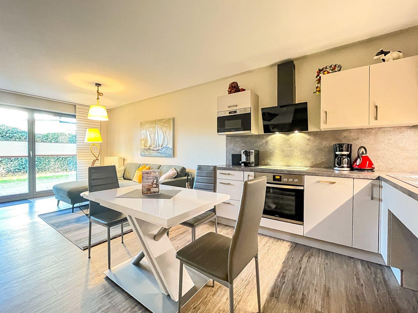 Die ca. 40 m² große Wohnung im Erdgeschoss verfügt über eine eigene Terrasse, ein Wohnzimmer mit Küchenzeile, ein Schlafzimmer sowie ein Badezimmer. Es sind nur 60 m zum Strand.