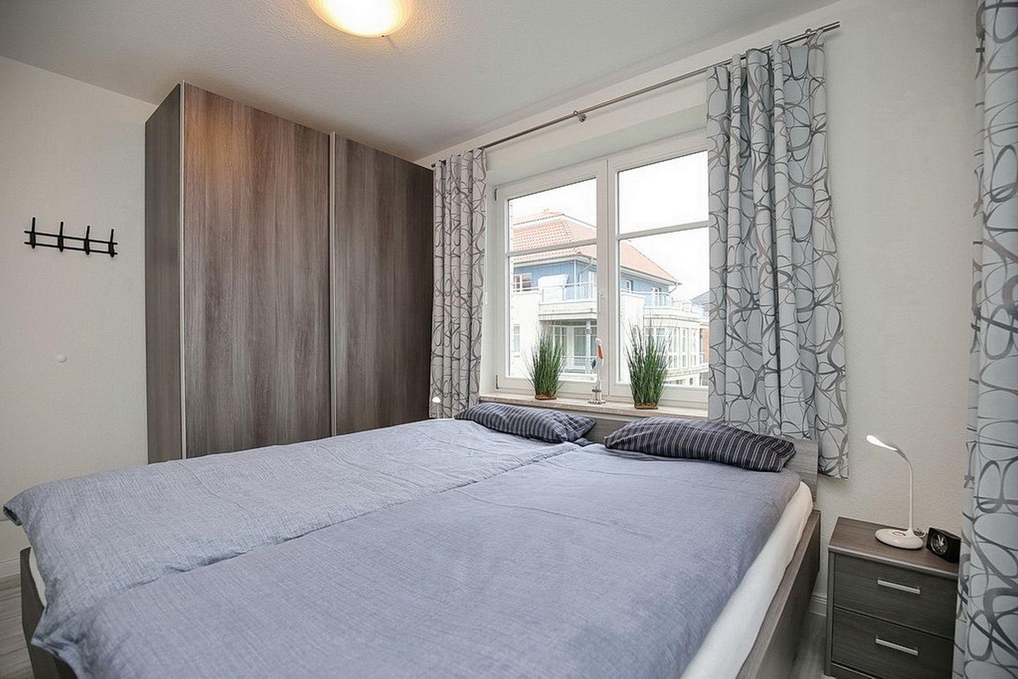 Zur Ausstattung im ersten Schlafzimmer gehören ein Doppelbett in Komforthöhe (2 x 90 x 200 cm) und im zweiten Schlafzimmer zwei Einzelbetten (90 x 200 cm). Beide Schlafräume bieten mit einem Kleiderschrank ausreichend Stauraum für deine Urlaubsgarderobe. Zur Verdunkelung gibt es Vorhänge an den Fenstern. Ein zusätzliches Kinderreisebett passt jedoch nicht in die Schlafzimmer.