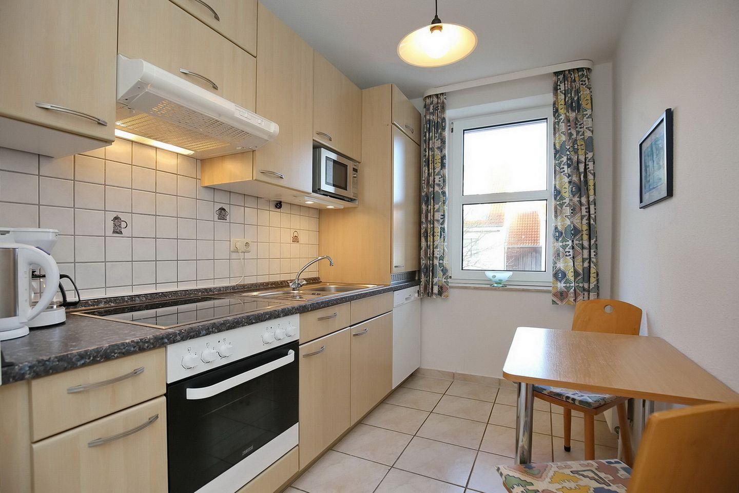 Die separate Küche ist mit einem Cerankochfeld mit Backofen, einem Geschirrspüler und einem Kühlschrank mit Gefrierfach ausgestattet. Ein kleiner Essplatz für zwei Personen ist ebenfalls vorhanden.