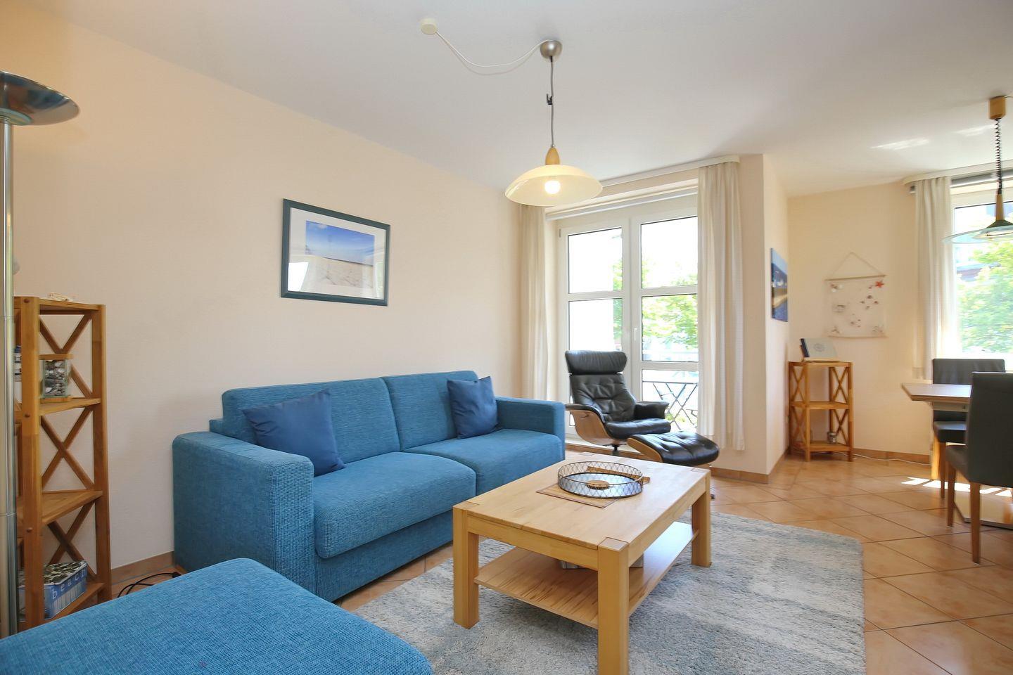 Den möblierten Balkon in Süd-Ost-Lage erreichst du aus dem Wohnzimmer. Der Wohnbereich ist mit einem modernen ausziehbarem Schlafsofa (170 x 200 cm), einem Jumbohocker, einem Designer-Lederrelaxsessel mit Liegefunktion und dazugehörigem Hocker sowie einem Echtholzcouchtisch und einem Essbereich für die gemeinsamen Mahlzeiten ausgestattet. Der Boden ist gefliest. Der moderne Flachbild-TV, die Stereoanlage mit Dockingstation sowie eine gut sortierte Auswahl an Büchern lassen keine Langeweile aufkommen.