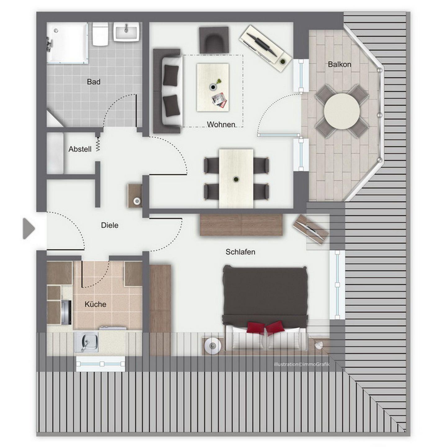 Der zusätzliche Abstellraum, der sich im Flur befindet, bietet Stauraum für die Balkonmöblierung und diverse kleine Haushaltsgegenstände. Außerdem ist ein Wäscheständer vorhanden.