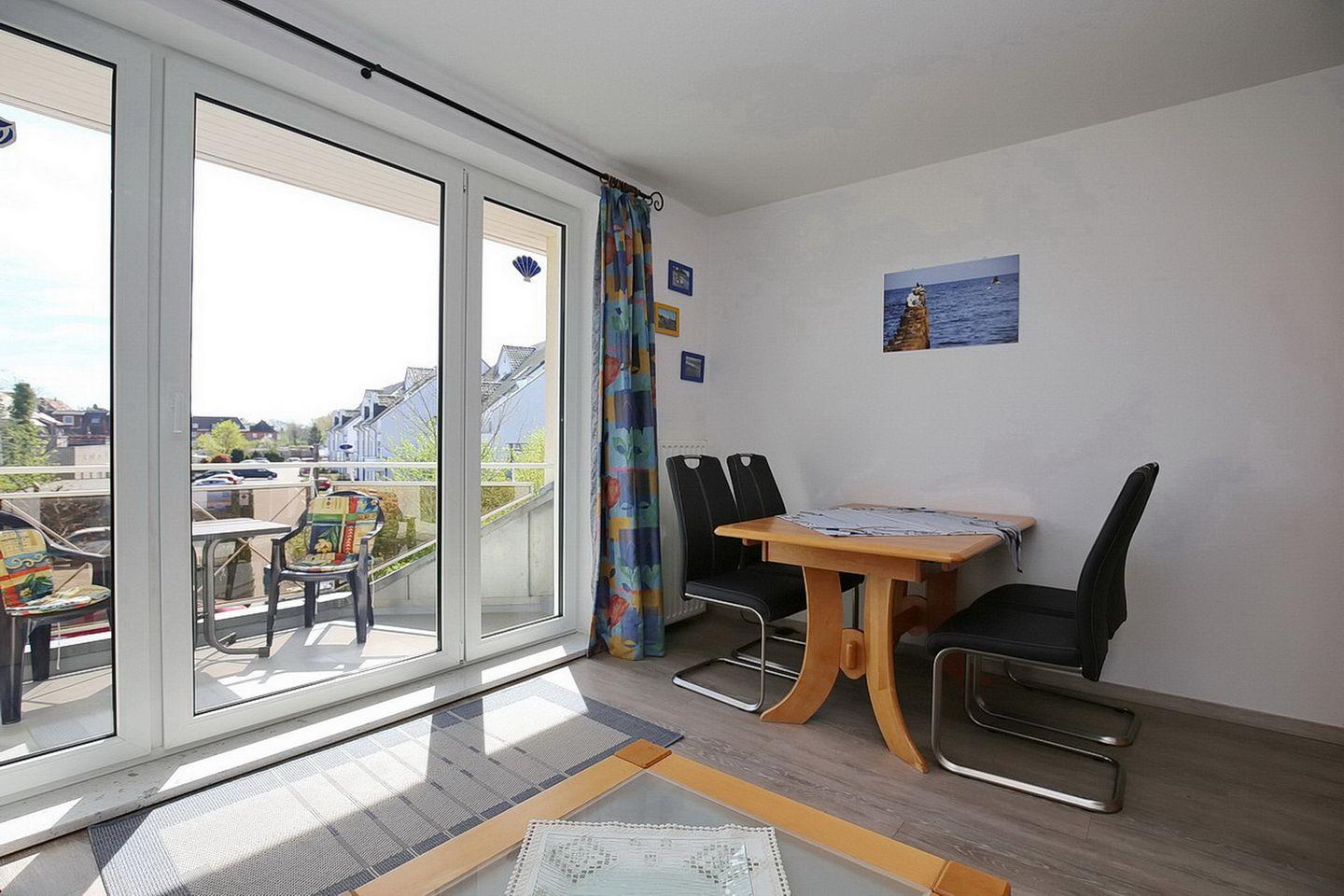 Im Wohnzimmer dieser Ferienwohnung findest du eine gemütliche Couch (180 x 190 cm) sowie einen großen Flachbild-TV vor. Hochwertiges Laminat wurde hier ausgelegt. Ein Essbereich lädt zum gemütlichen Speisen ein. Vom Wohnzimmer aus gelangst du direkt auf den mit Balkonmöbeln ausgestatteten Balkon.