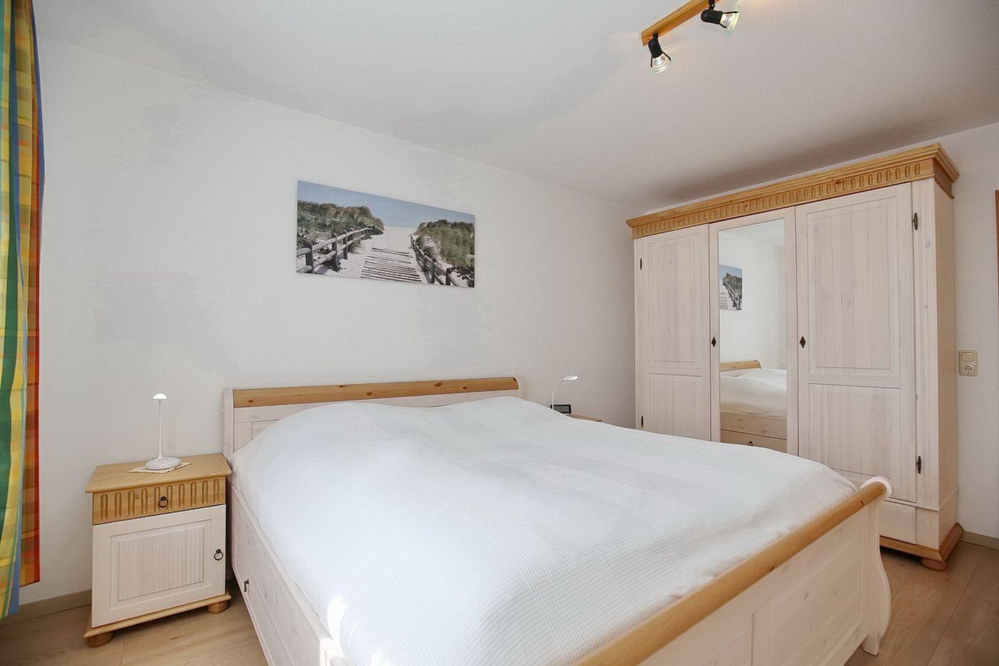 Im Schlafzimmer wurde Laminat verlegt. Hier befinden sich ein Doppelbett (2 x 90 x 200 cm) für 2 Personen, ein großer Kleiderschrank und ein zweiter Fernseher. Für die kleineren Gäste steht ein Kinderbett bereit. Mit Rollos kannst du den Raum abdunkeln.