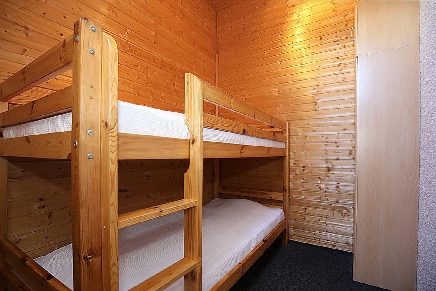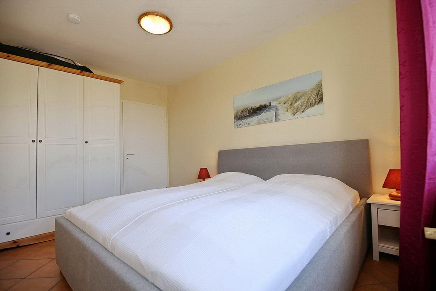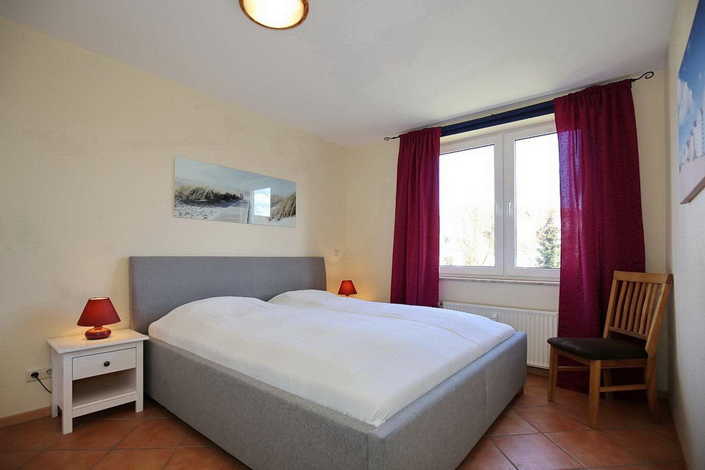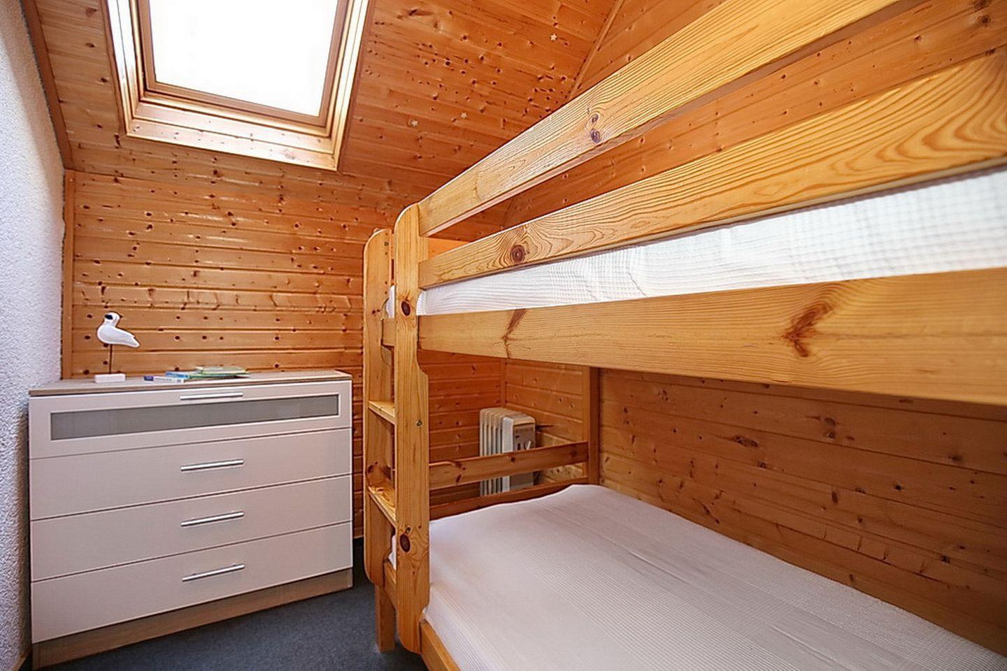 Das bequeme Doppelbett (2 x 90 x 200 cm) und ein großer Kleiderschrank sorgen für deinen Komfort. An den Fenstern befinden sich Rollos. Das zweite Schlafzimmer ist mit einem Etagenbett (90 x 200 cm) und einer Kommode für deine Urlaubskleidung eingerichtet.