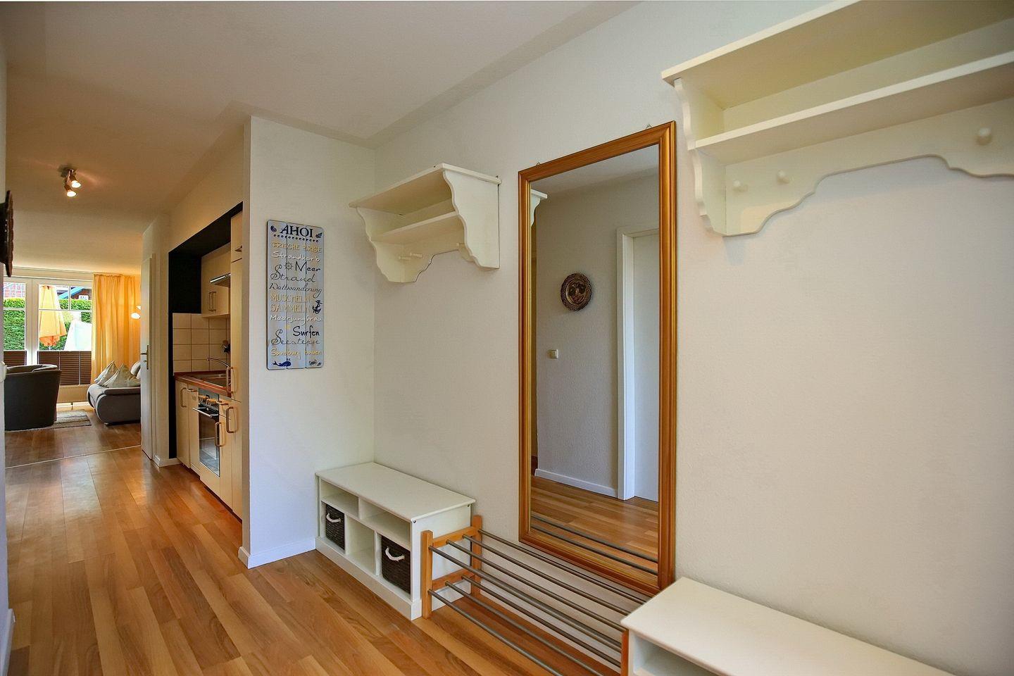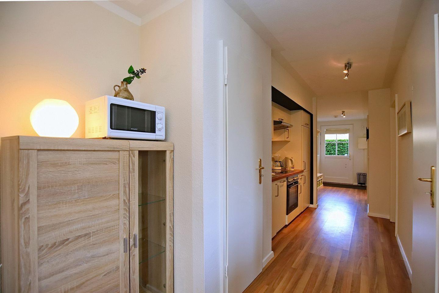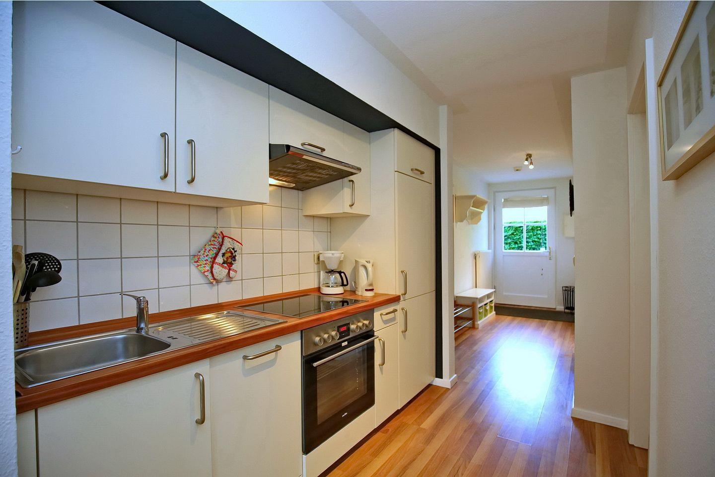 Die integrierte Küchenzeile ist mit einem Backofen mit Cerankochfeld, einem Geschirrspüler, einem Kühlschrank mit Gefrierfach und einer Mikrowelle ausgestattet. In der gesamten Ferienwohnung wurde Laminat verlegt.