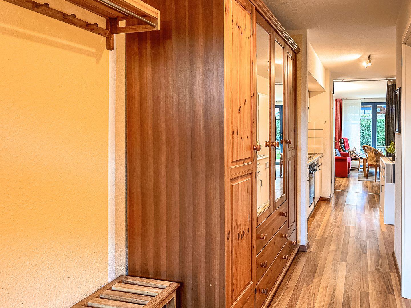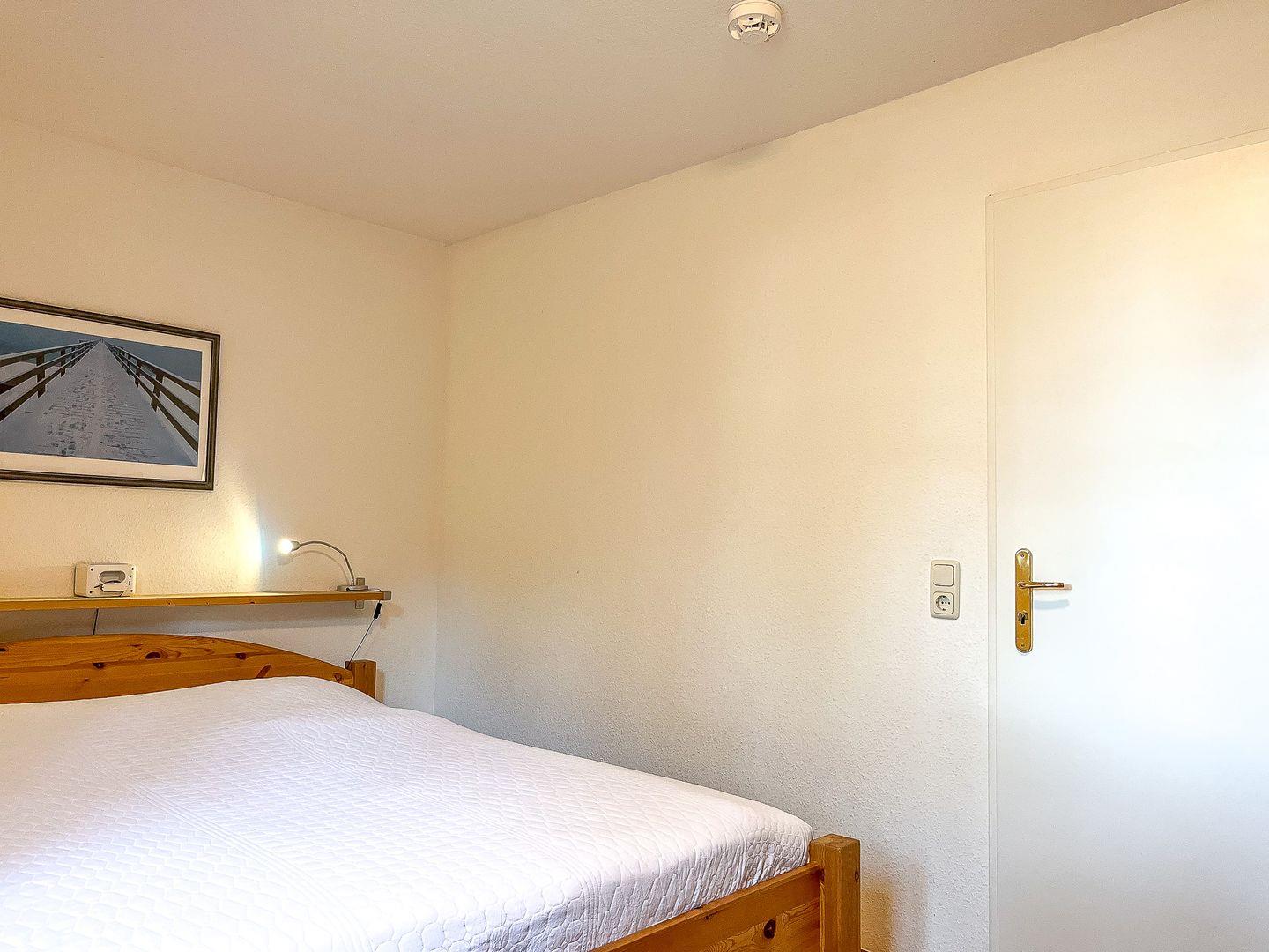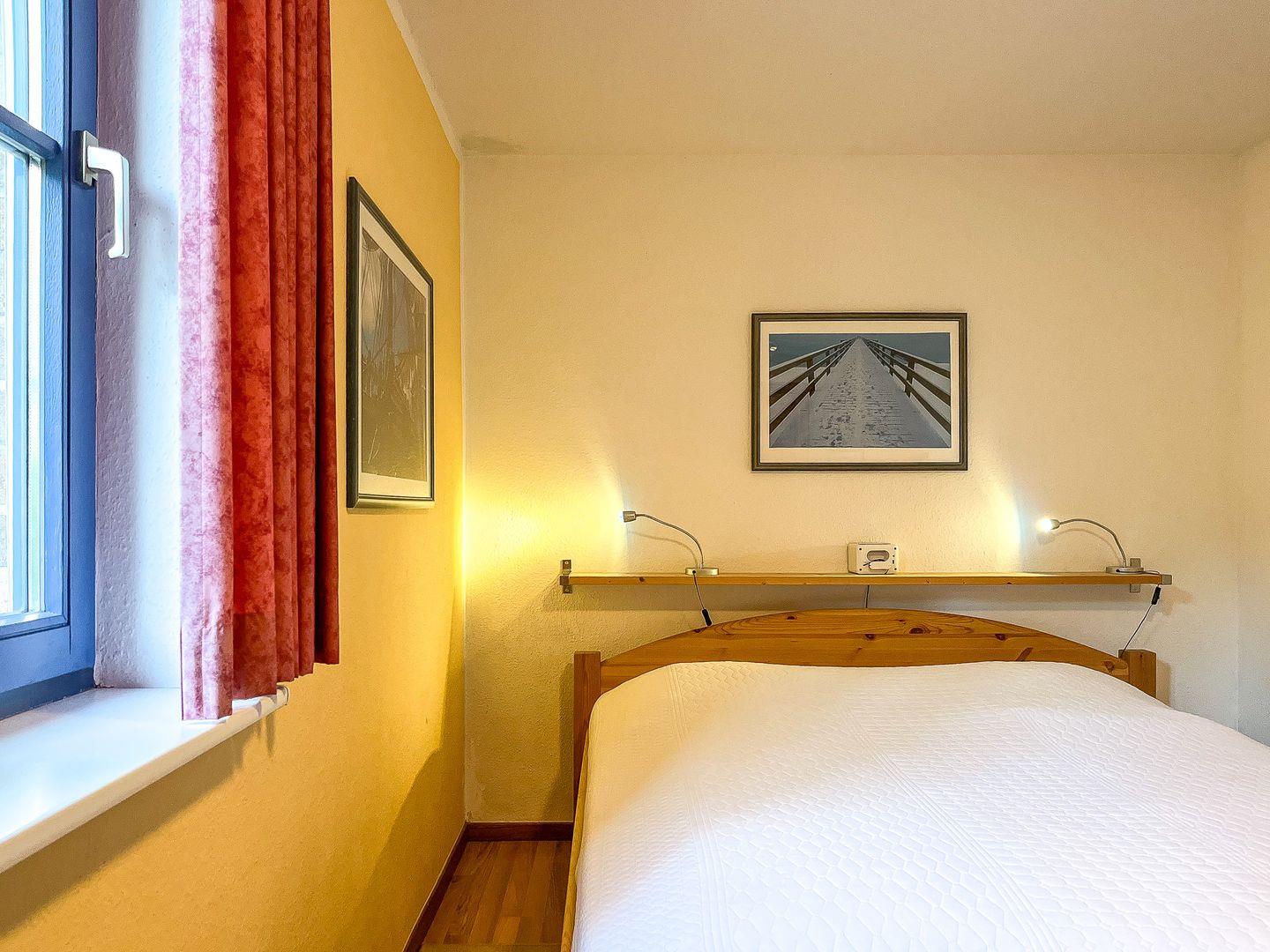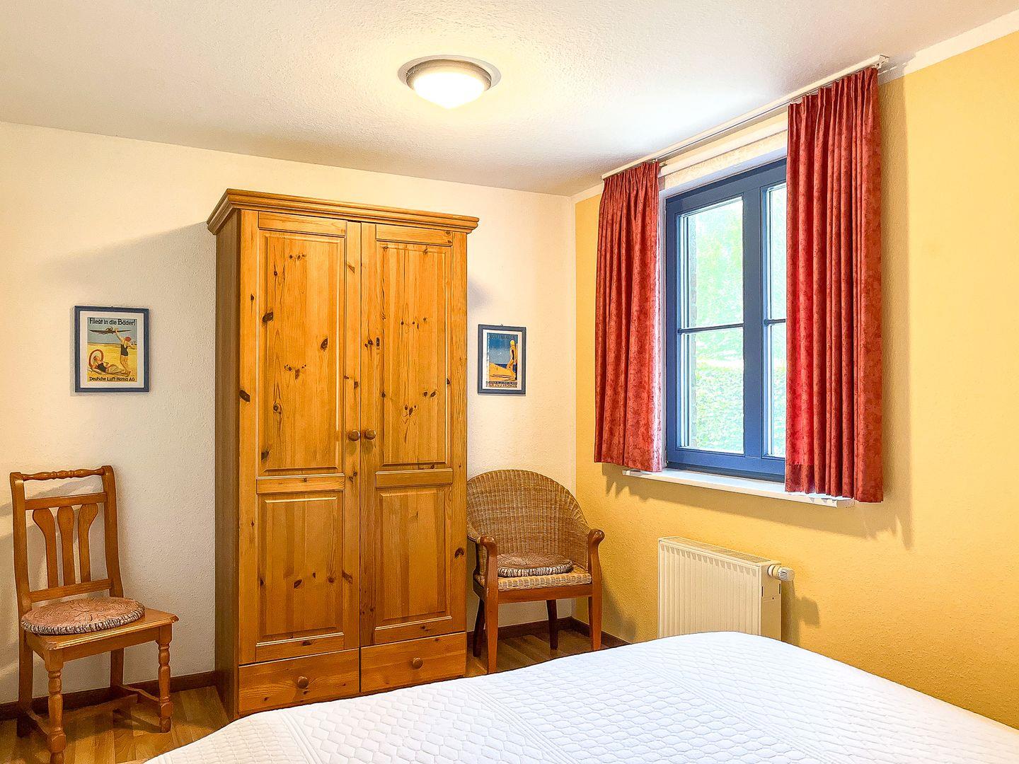Das Schlafzimmer ist mit einem Doppelbett (2 x 90 x 200 cm) und einem Kleiderschrank möbliert. Als Sichtschutz am Fenster dienen Gardinen. Ein geräumiger Kleiderschrank im Eingangsbereich schafft zusätzlichen Stauraum für deine Urlaubsgarderobe.