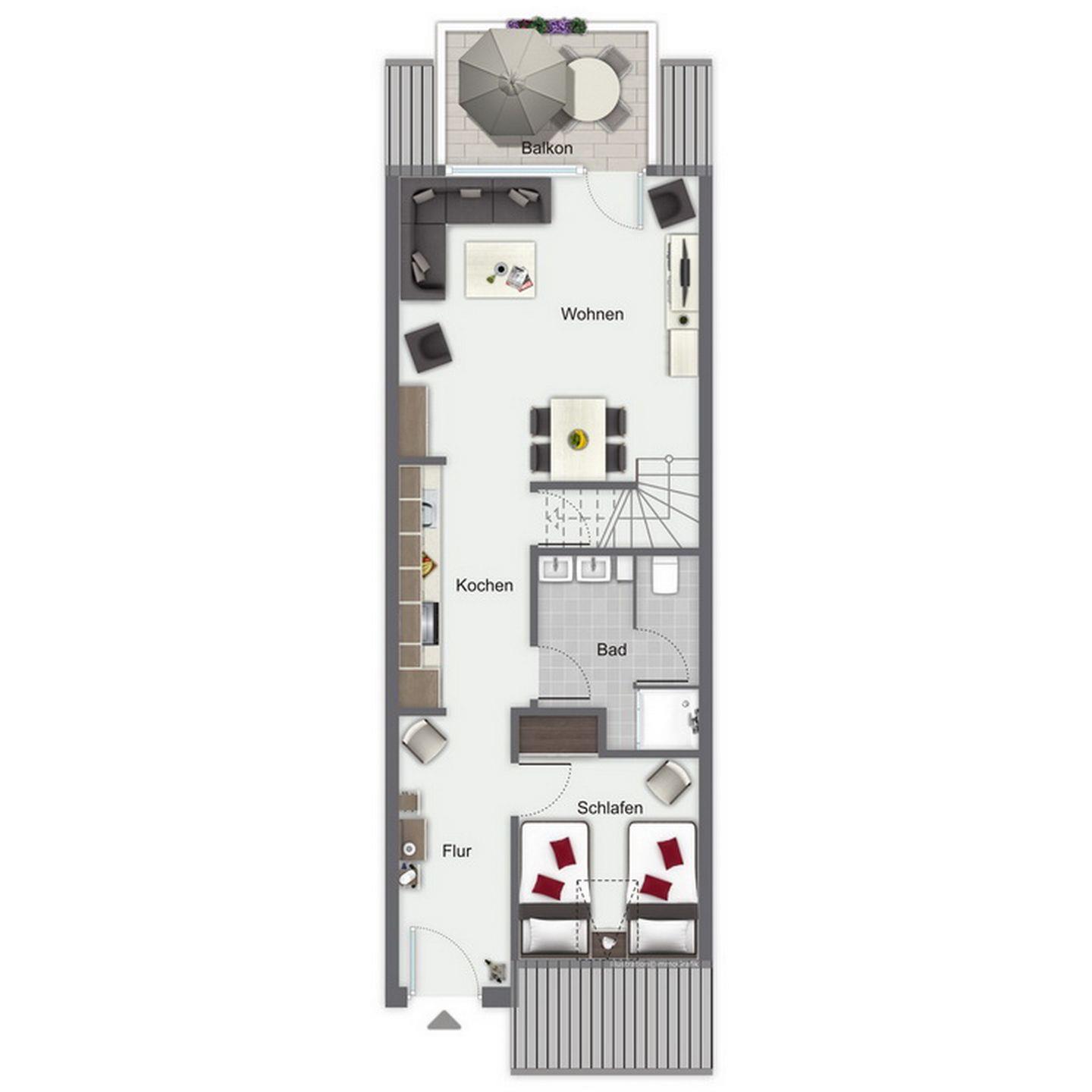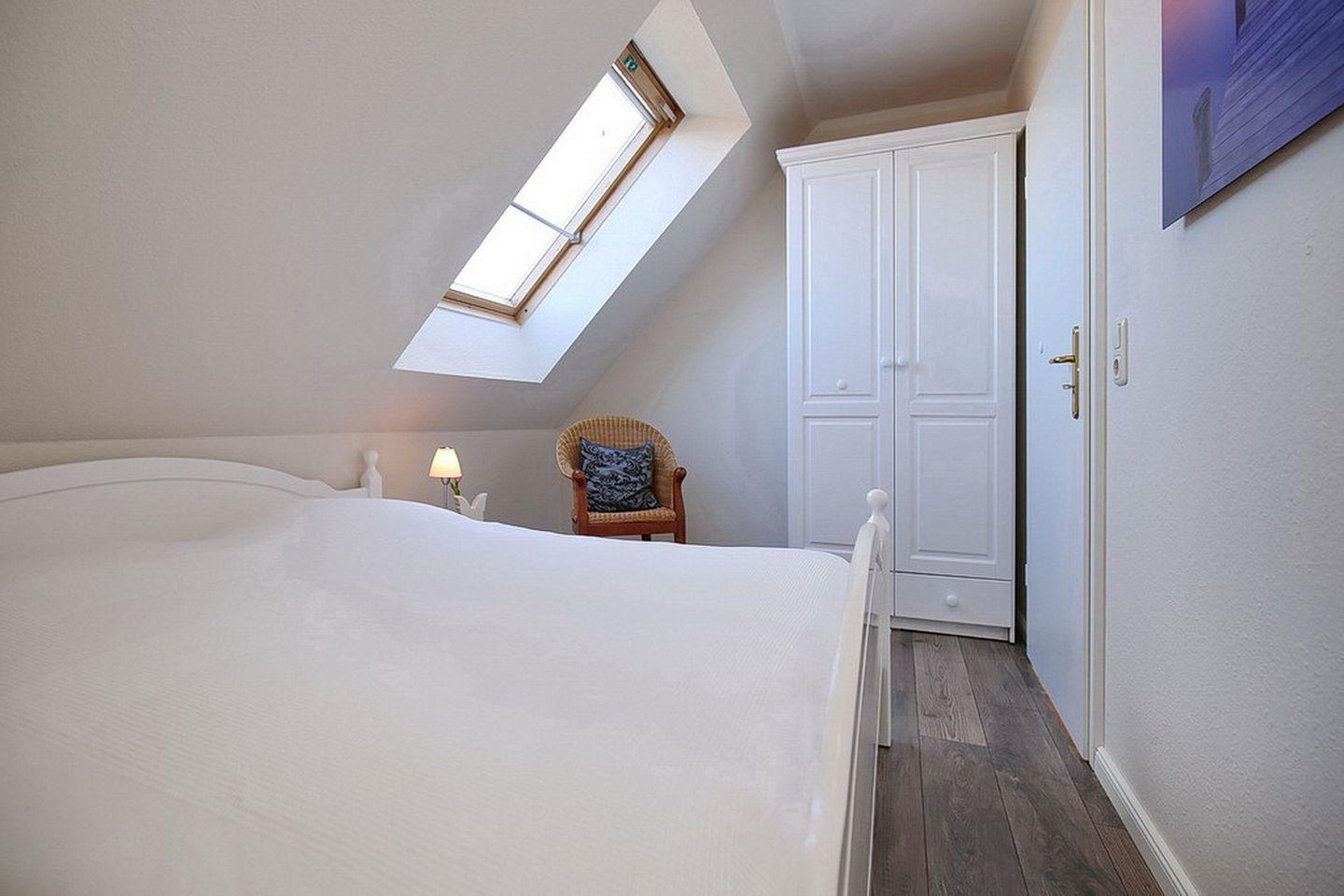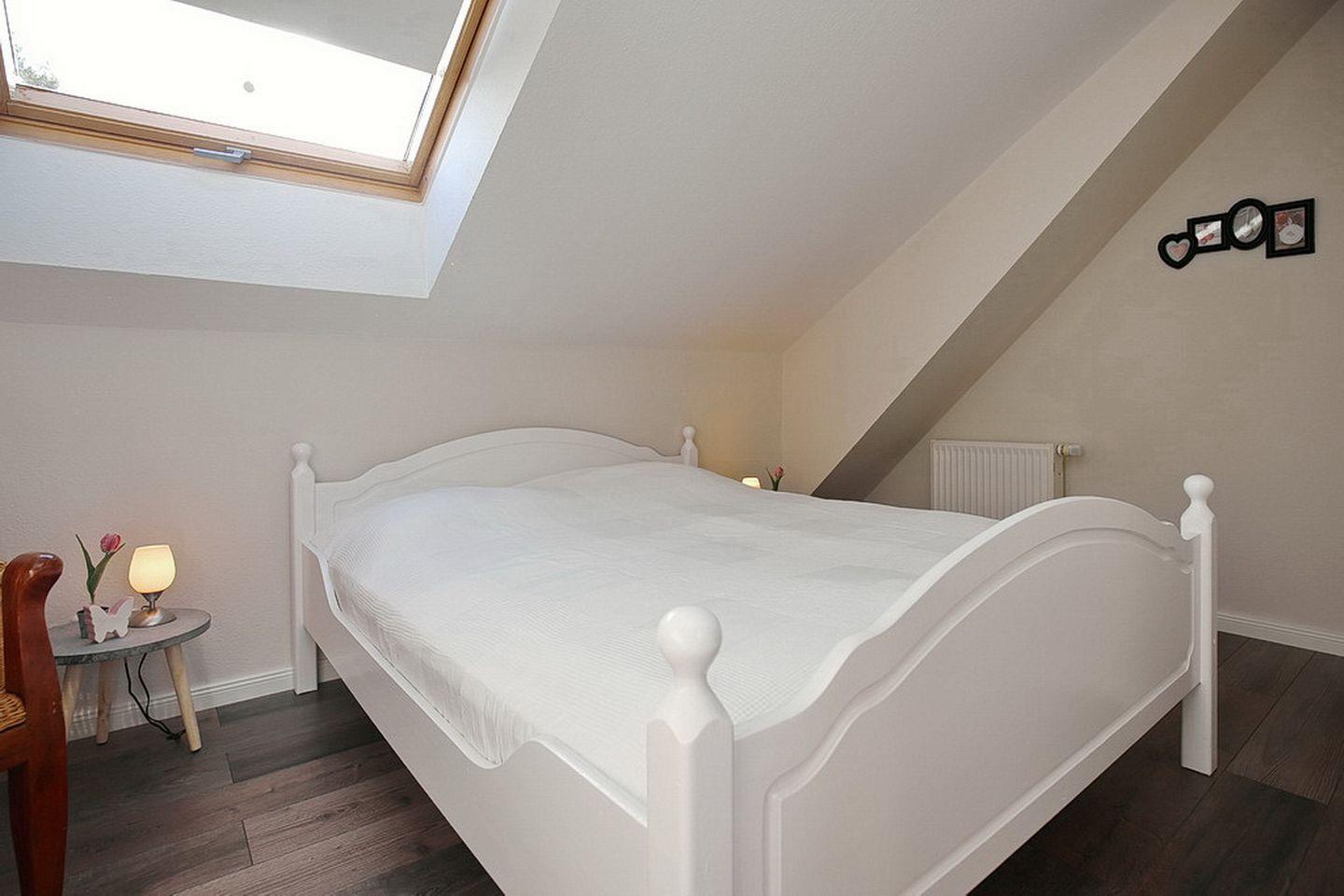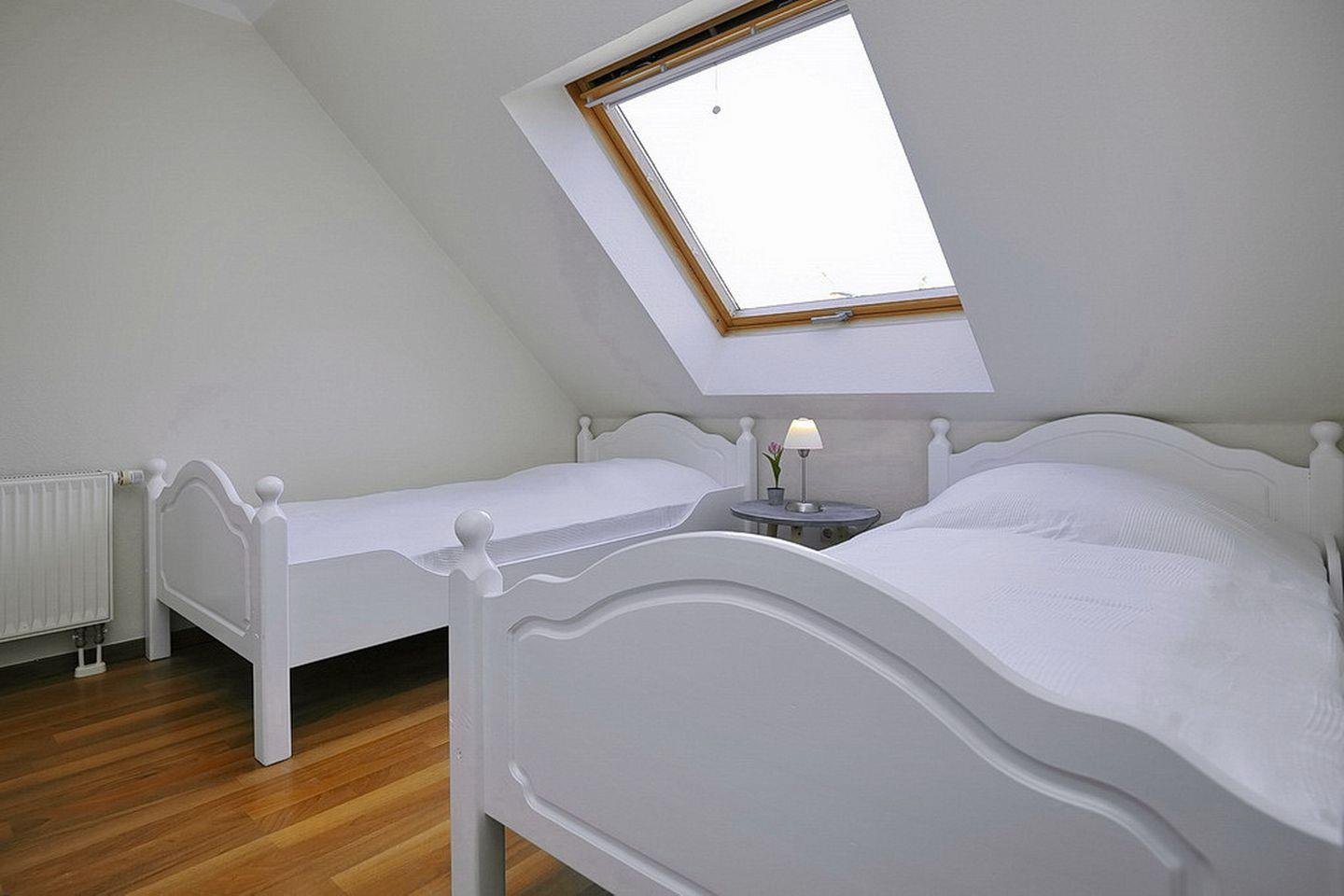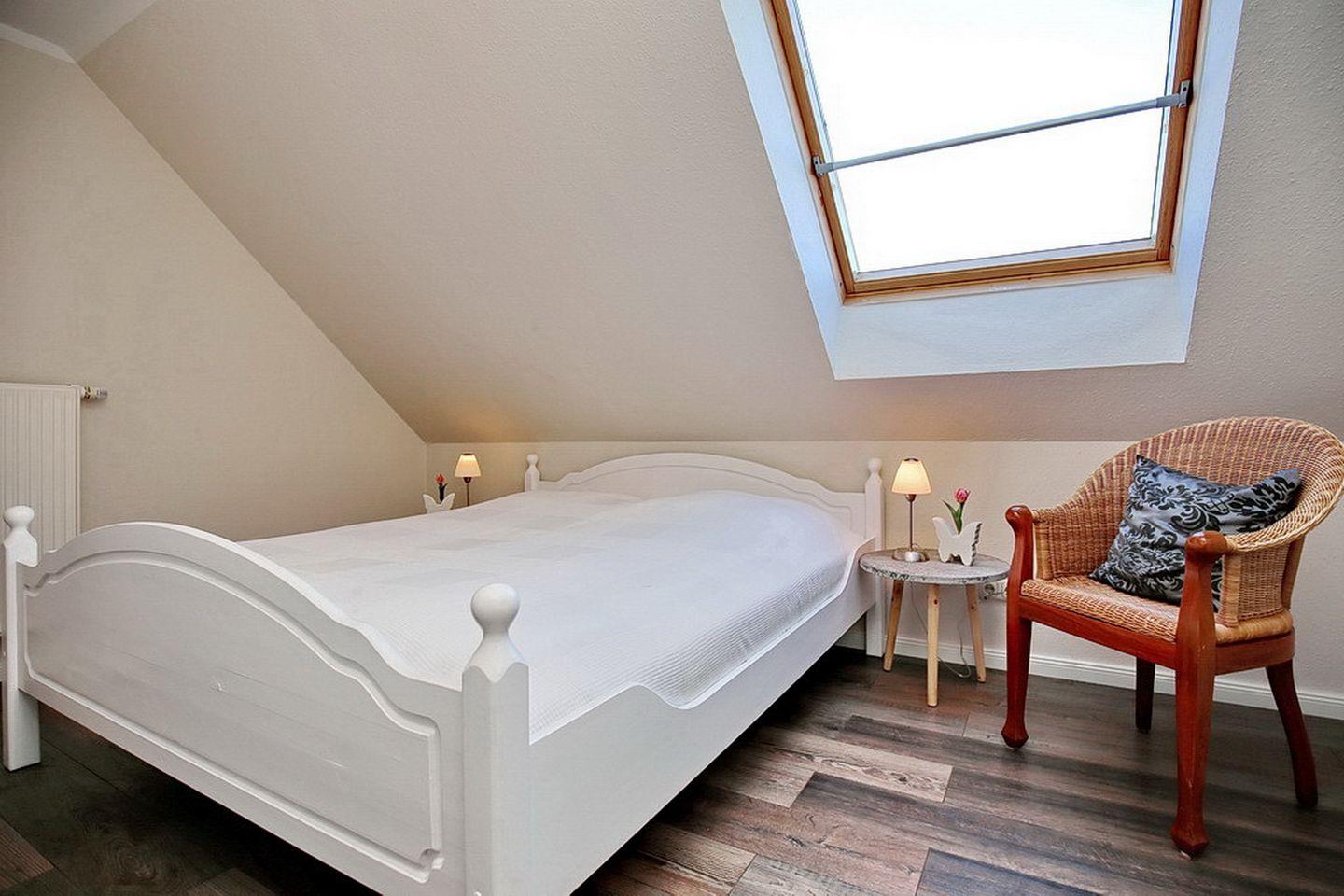 Eine innenliegende Treppe führt in das Dachgeschoss mit zwei weiteren Schlafzimmern. Beide Schlafräume sind mit jeweils einem Doppelbett (2 x 90 x 200 cm) und einem Kleiderschrank ausgestattet. Zur Verdunkelung der Fenster sind in allen Schlafbereichen Rollos vorhanden. Der Bodenbelag im Obergeschoss ist ebenfalls Laminat.