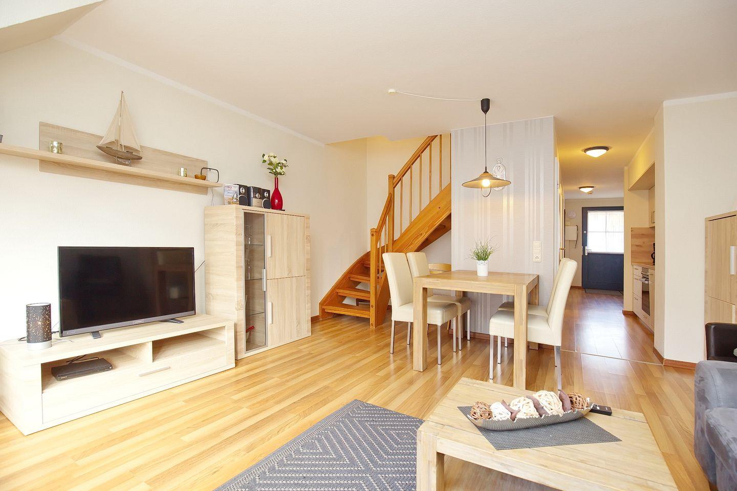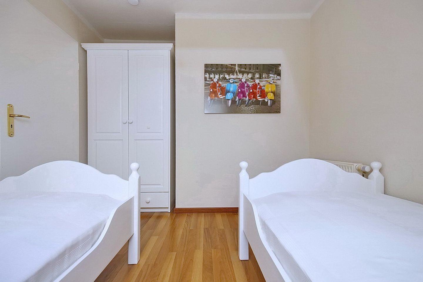 In der voll ausgestatteten Küchenzeile, die kürzlich renoviert wurde, findest du einen Geschirrspüler, ein Cerankochfeld, einen Backofen, eine Mikrowelle und einen Kühlschrank mit Gefrierfach. Das Schlafzimmer in der unteren Ebene ist mit zwei Einzelbetten (90 x 200 cm) und einem Kleiderschrank möbliert. Der Bodenbelag in der gesamten unteren Etage ist Laminat.