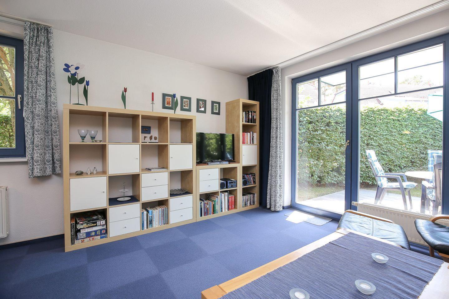 Die Terrasse schließt sich direkt dem Wohn- und Essbereich an und ist mit Liegestuhl, vier Sesseln mit Auflagen, Tisch und Sonnenschirm möbliert. Der Wohnbereich ist mit gemütlichem Schlafsofa (140 x 200 cm), Relax-Sessel und Essecke offen gestaltet. Zur Ausstattung gehören ein Flachbild-TV, ein DVD-Player, eine Stereoanlage mit USB-Anschluss und Dockingstation, sowie eine kleine Auswahl an DVDs, CDs und Büchern.