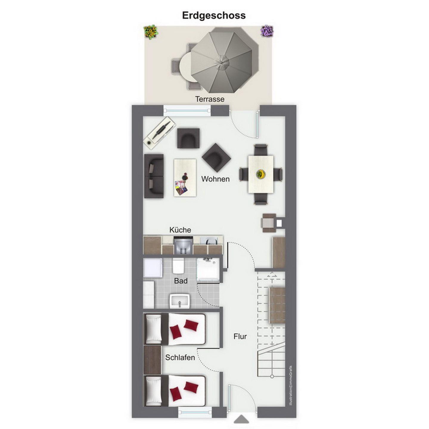 Dieses Ferienhaus verfügt über komfortable drei Zimmer auf 2 Ebenen. Auf ca. 54 m² verfügst du über das Wohnzimmer mit Küchenzeile, 2 Schlafzimmer, 1 Duschbad und ein Gäste-WC. Die Terrasse ist südlich ausgerichtet. Die Strandentfernung beträgt ca. 350 Meter.