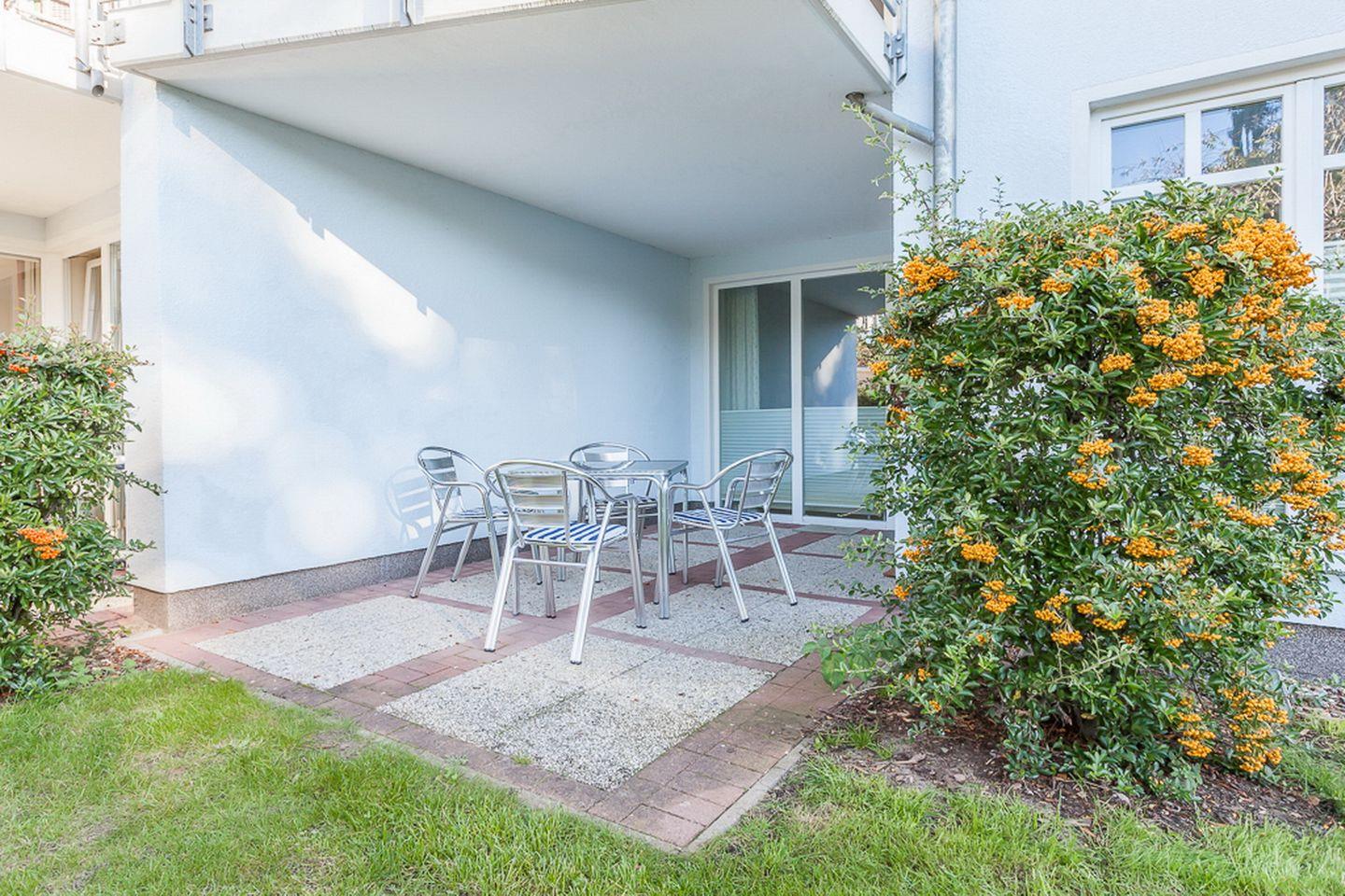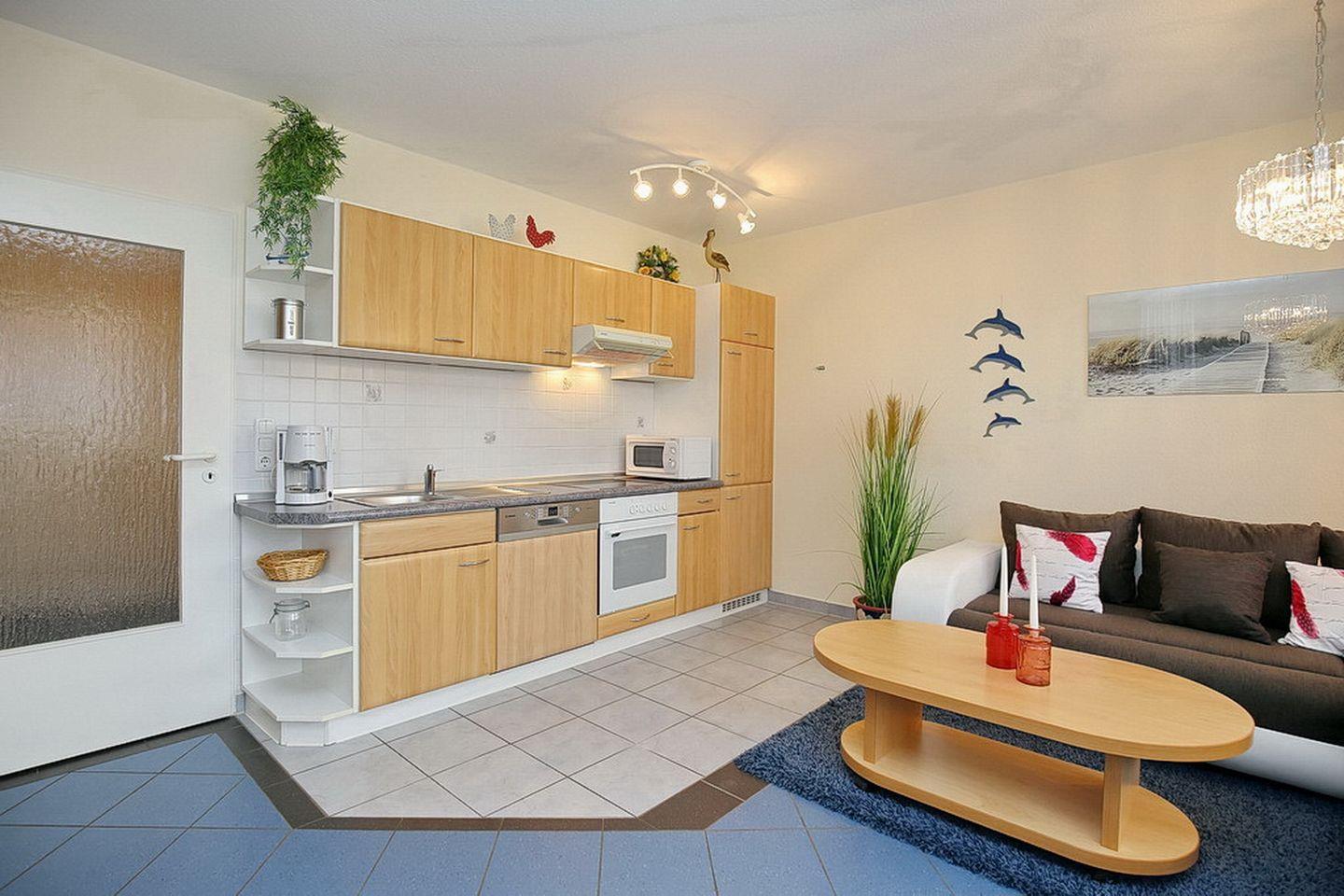 Diese 2-Zimmer-Wohnung (ca. 50 m²) liegt im Erdgeschoss zur Westseite der Anlage und verfügt über ein Wohnzimmer mit Küchenzeile, ein Schlafzimmer, ein Duschbad sowie die westlich ausgerichtete Terrasse. Zum Strand sind es nur ca. 70 Meter.