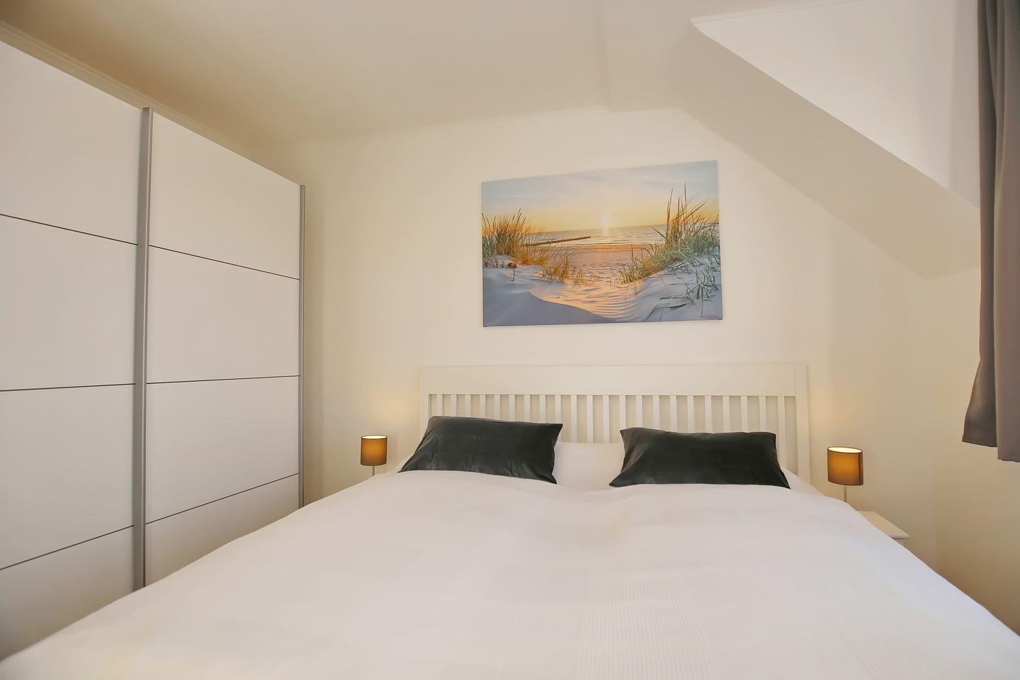 Im separaten Schlafzimmer, das mit Laminat ausgelegt ist, befindet sich ein komfortables Doppelbett in Komforthöhe (2 x 90 x 200 cm) sowie ein großzügiger Einbaukleiderschrank. Auch vom ruhigen Schlafzimmer aus hast du einen wunderschönen Blick über das naturgeschützte Haff und weite Wiesen. Vorhänge dienen als Sicht- und Sonnenschutz.