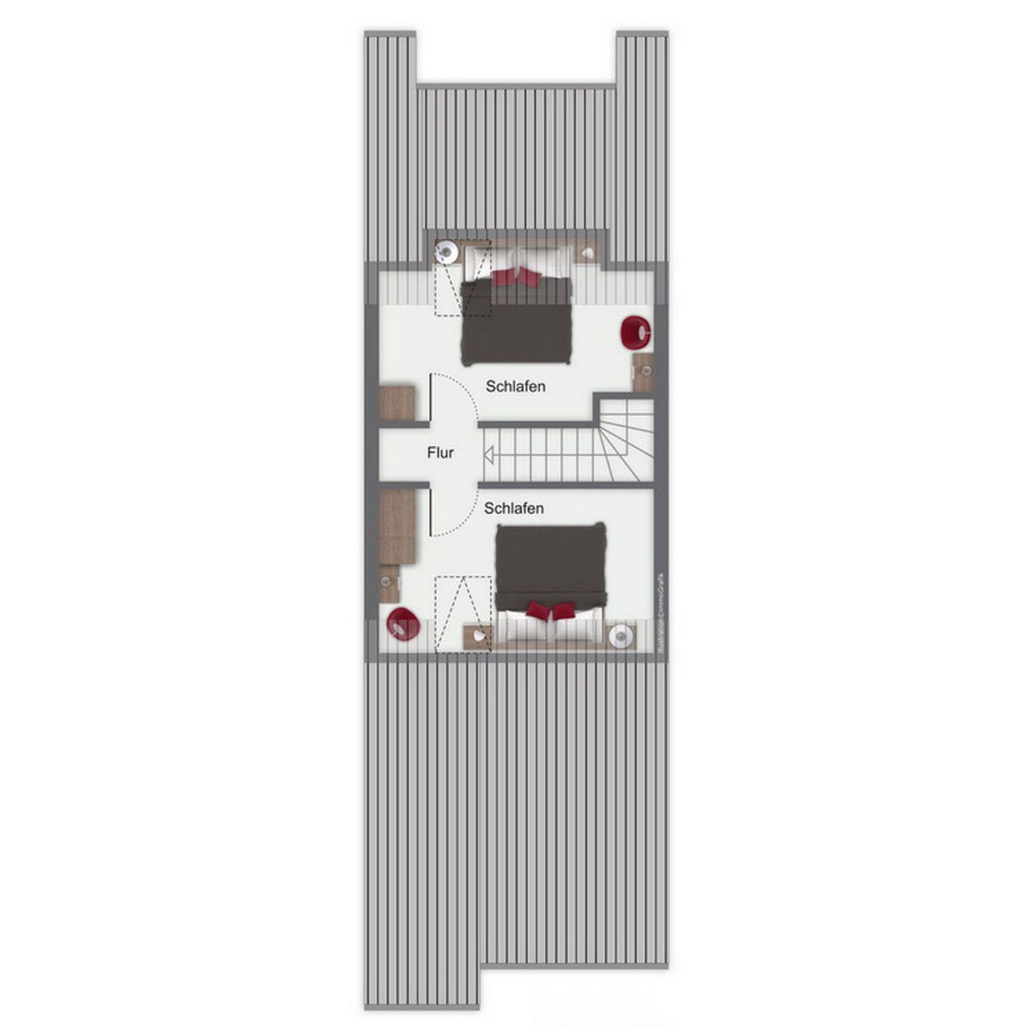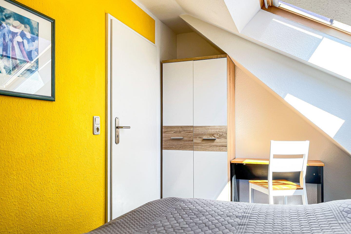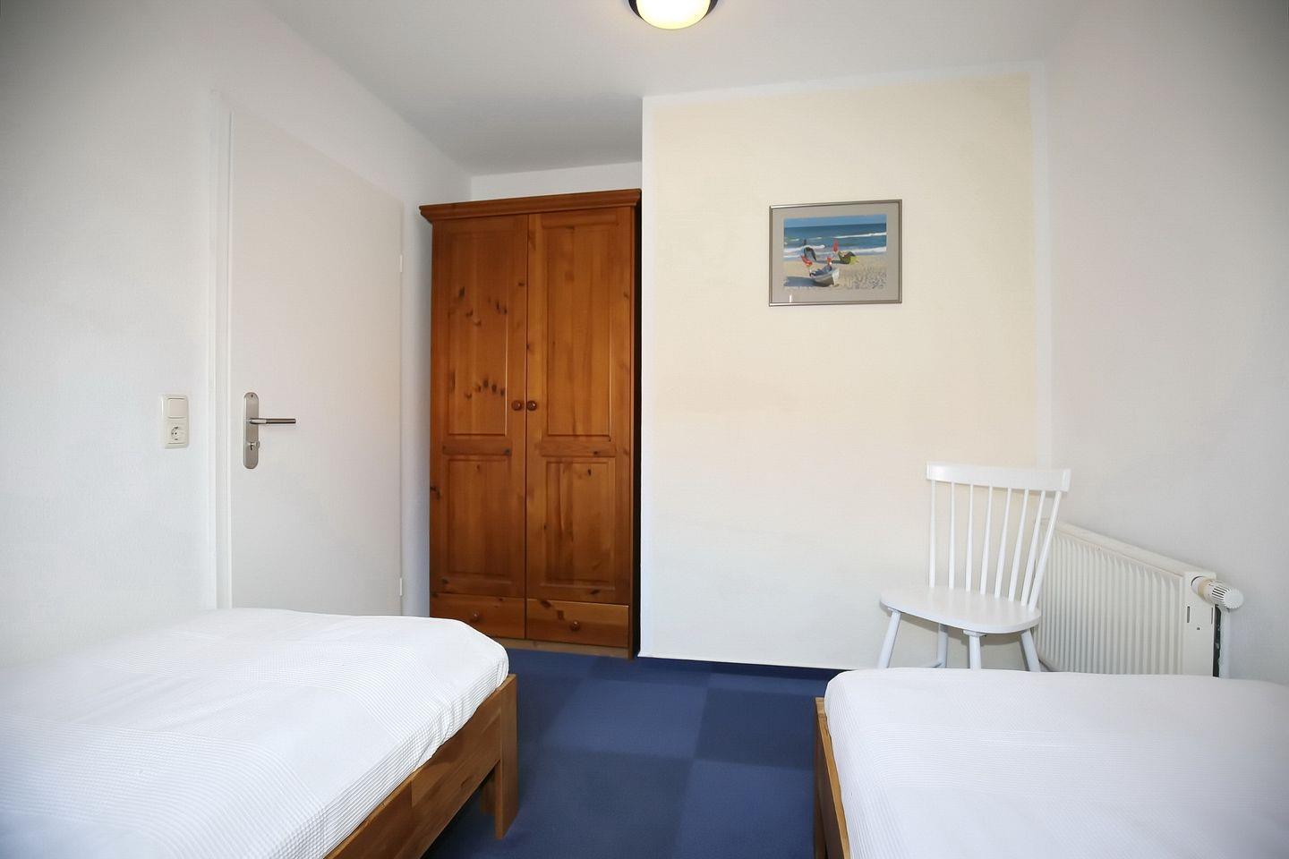 Auf der unteren Ebene befindet sich ein Schlafzimmer mit zwei Einzelbetten (90 x 200 cm) und einem Kleiderschrank. Über eine innenliegende Treppe erreichst du die beiden oberen Schlafräume mit jeweils einem Doppelbett (2 x 80 x 200 cm und 2 x 90 x 200 cm) und einem Kleiderschrank. Die Zimmer ermöglichen Rückzug und Ruhephasen auch tagsüber. In allen Schlafzimmern liegt Teppichboden. Die Fenster können mit Rollos verdunkelt werden.