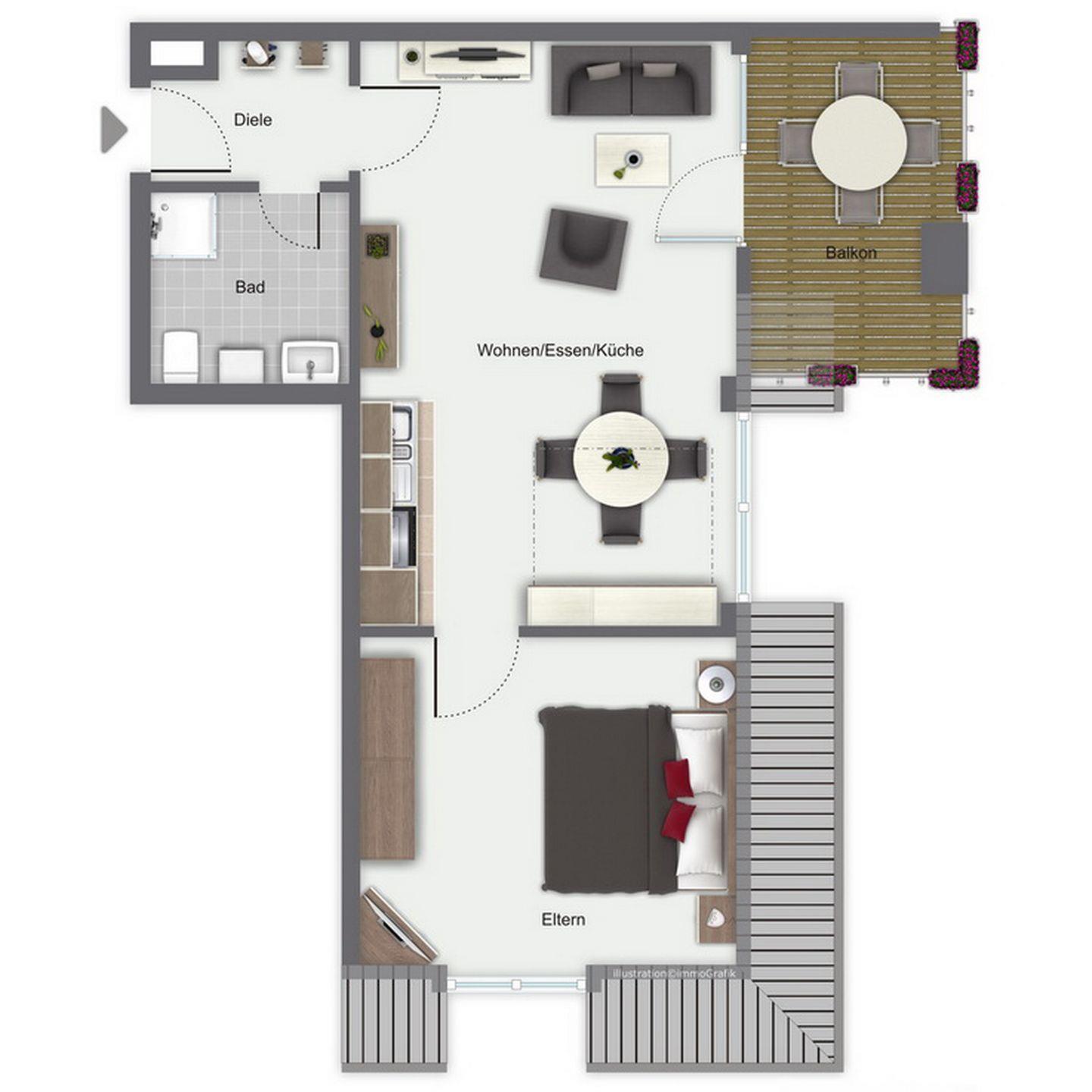In der im Wohnzimmer integrierten Küchenzeile findest du u. a. einen Geschirrspüler, einen Herd mit einem 4-Platten-Cerankochfeld, einen Backofen und eine Mikrowelle. Das Bad mit Dusche/WC besitzt einen Föhn und einen Kosmetikspiegel. Boden und Wände sind modern gefliest.