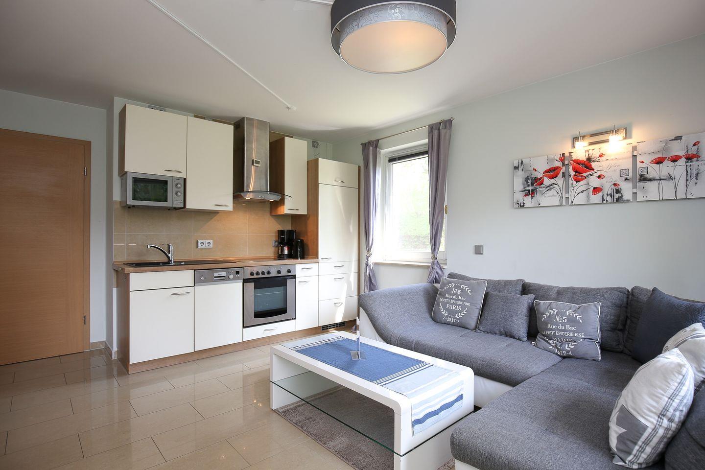 Die moderne Küche des Ferienhauses bietet dir neben einem Cerankochfeld natürlich auch einen Backofen, eine Mikrowelle und einen Geschirrspüler sowie eine pflegeleichte Granitspüle mit passenden Armaturen.